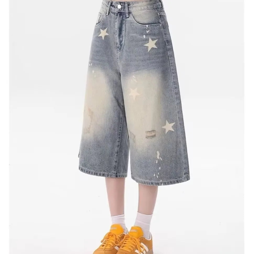 GETADME DM American Vintage Washed Star Denim Shorts Y2k High Waist Straight Wide Leg Jeans 2025 New Loose Knee-Length Pants