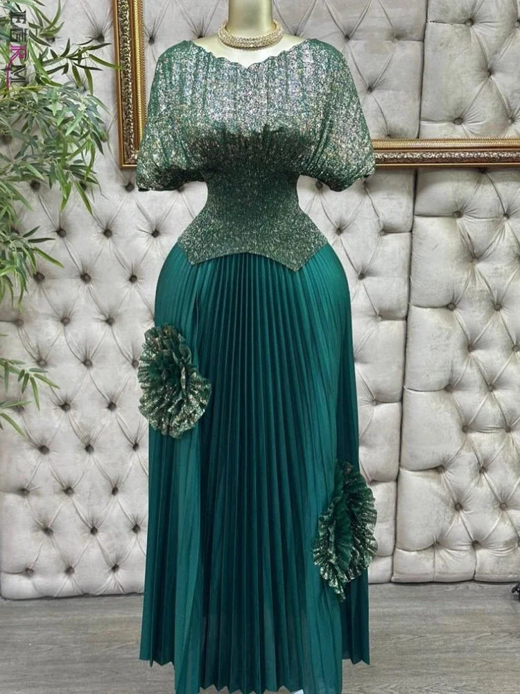 GETADME EGRM Pleated 2 Pieces Set Women Fashion V Neck Short Batwing Half Sleeved Irregular Hem Top + 3D Flowers A-line Folds Skirt 6R81