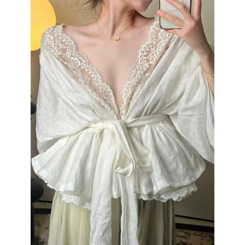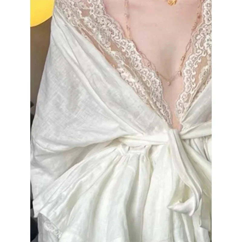 GETADME Elegant Lace Shirts Women Vintage Sexy V Neck Bandage Blouses Summer Fairy Korean Patchwork Long Sleeve Casual Design Tops New