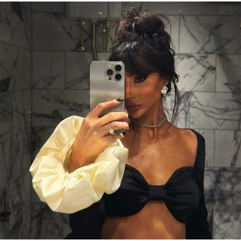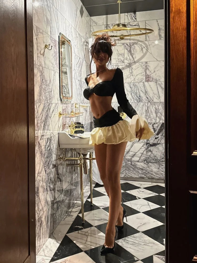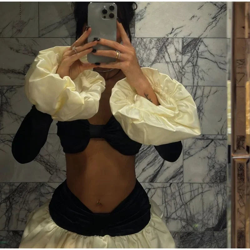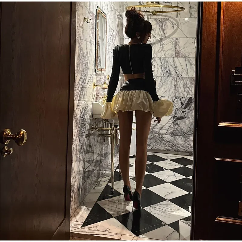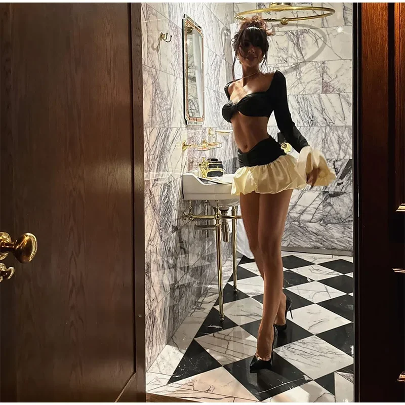 Getadme Elegant Lady Contrasting Puff Pleated Hem Mini Skirt Suits Sexy Long Sleeves Slim Cropped Top Pleated Skirts Chic Lady Outfits