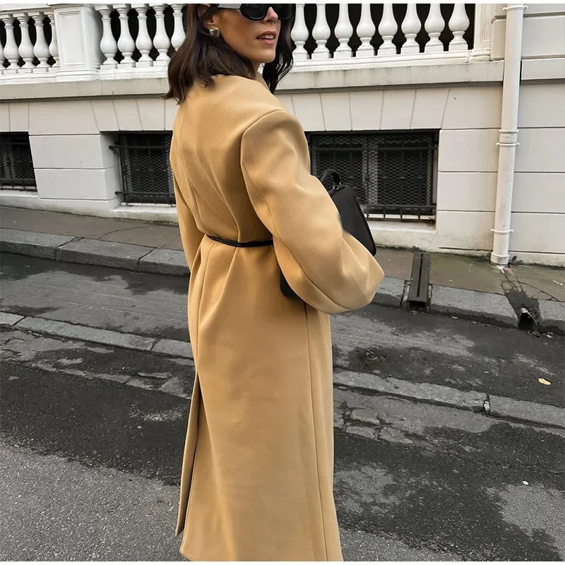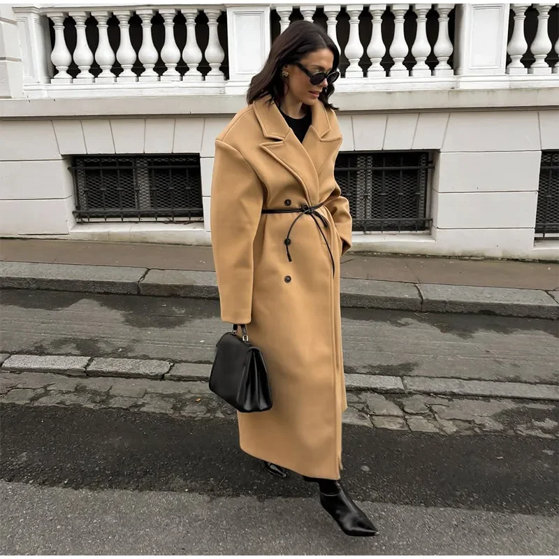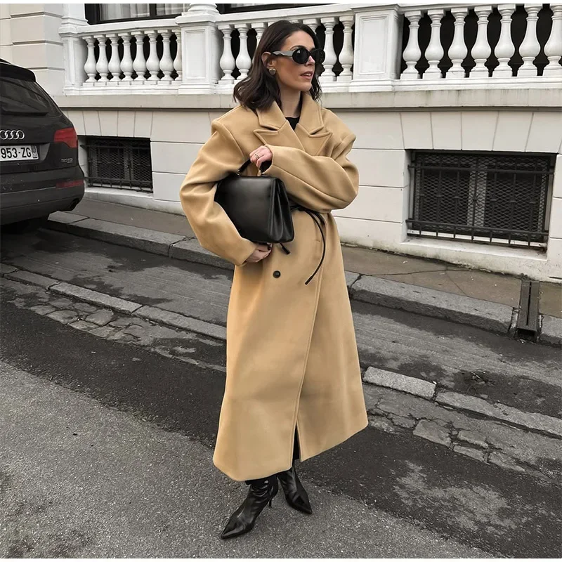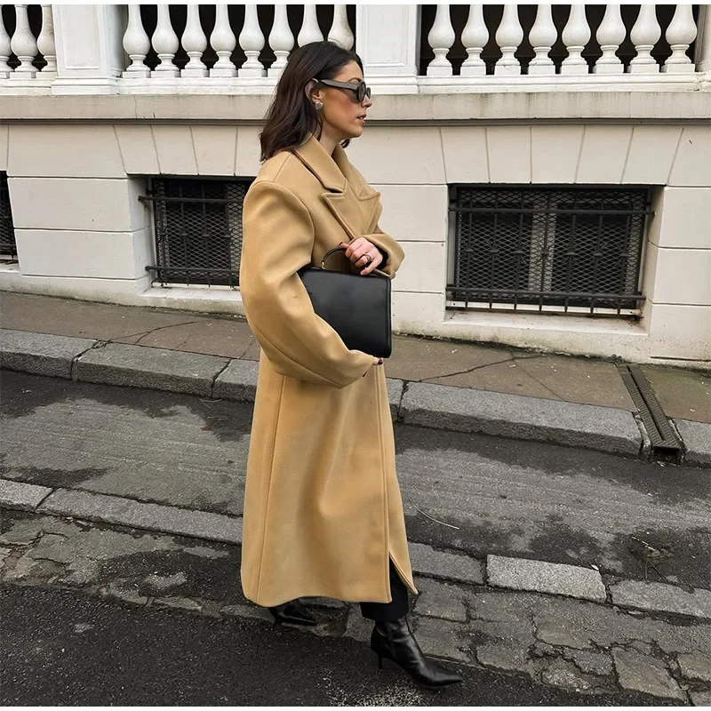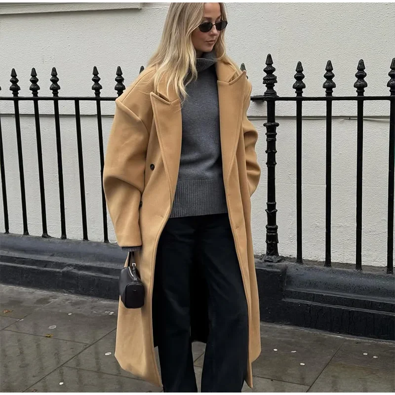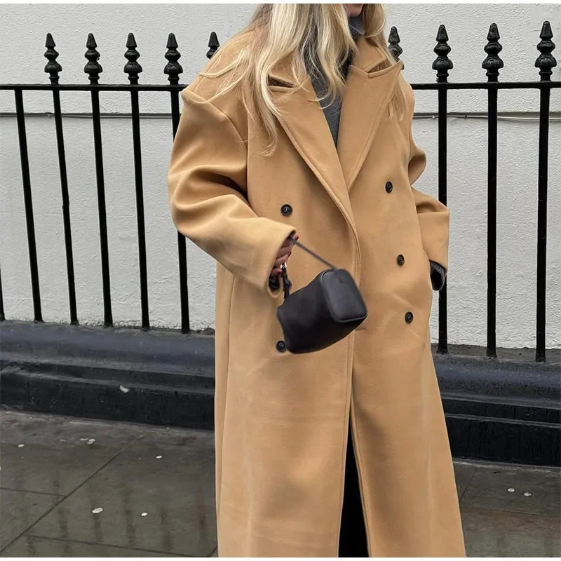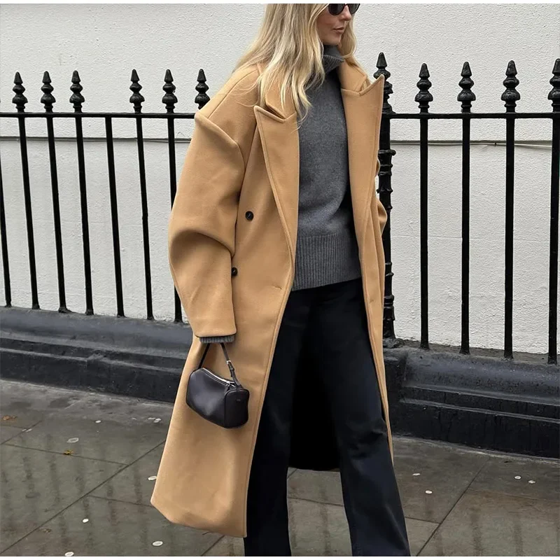 GETADME Fall Winter Woman Solid Color Lapel Long Woolen Jacket Fashion Double Breasted Full Sleeves Casual Overcoat New Commuter Coat