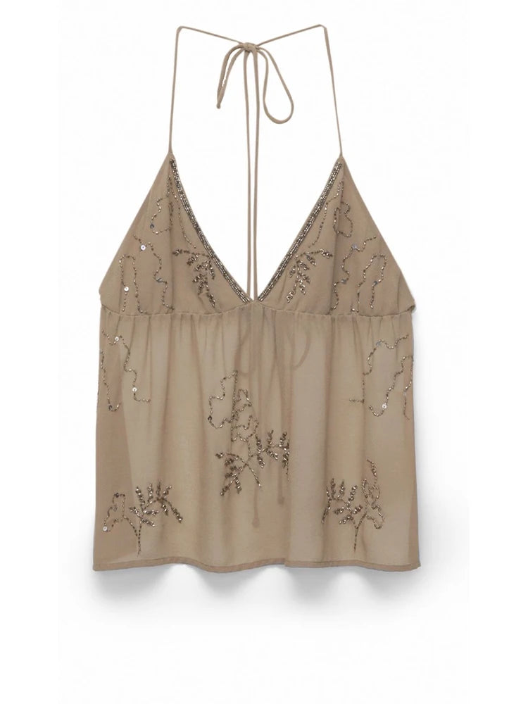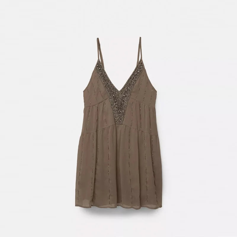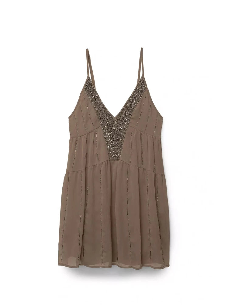 GETADME Fashion Beaded Short Dress For Women V-neck Sleeveless Backless Draped Diamonds Dresses 2025 Summer Chic Ladies Beach Vestidos