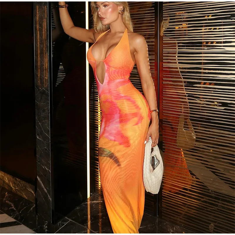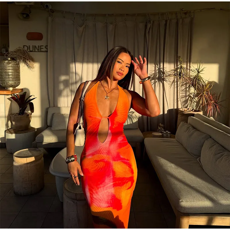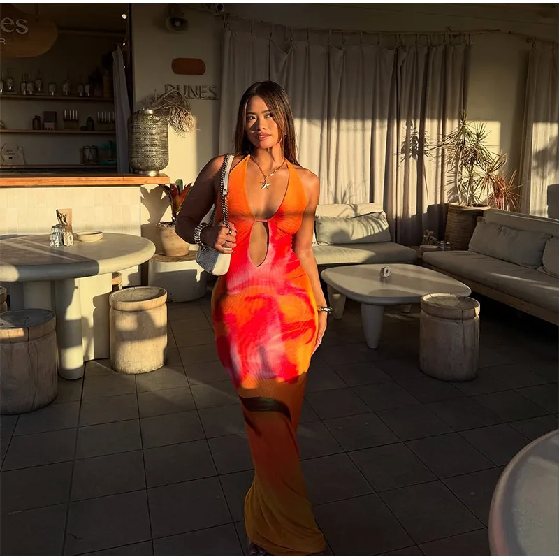 GETADME Fashion Hollow Out Print Maxi Dress Women Sleeveless Backless Bodycon Long Dresses 2025 New Beach Vocation Sexy Vestidos
