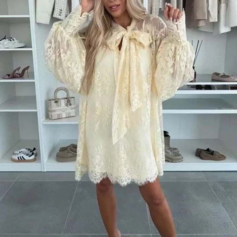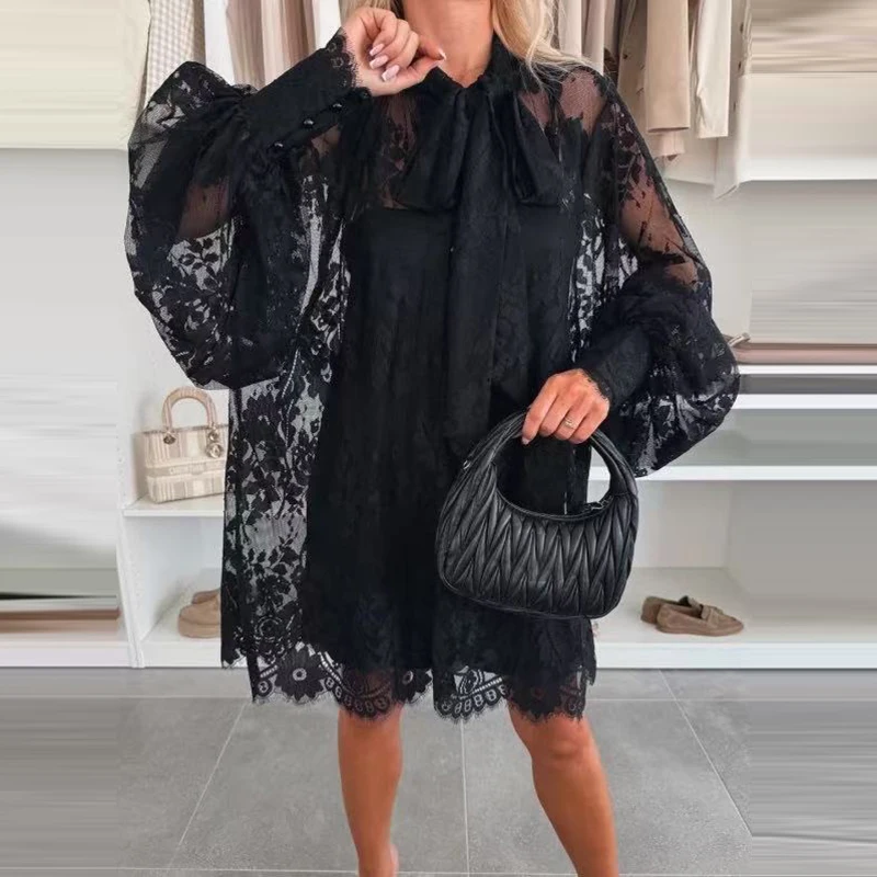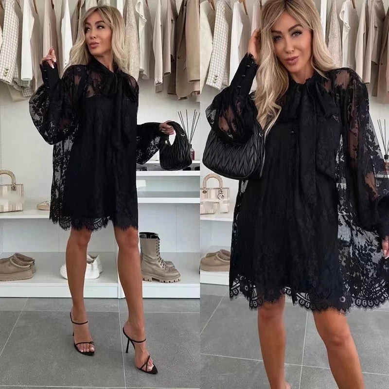 GETADME Fashion Lantern Sleeve Loose Dress New Sexy Perspective Lace Embroidered Chiffon Women Dress 2025 Spring Bow Tie Up Party Dress