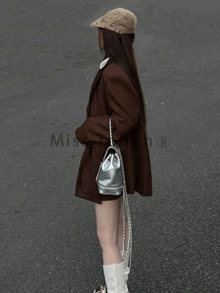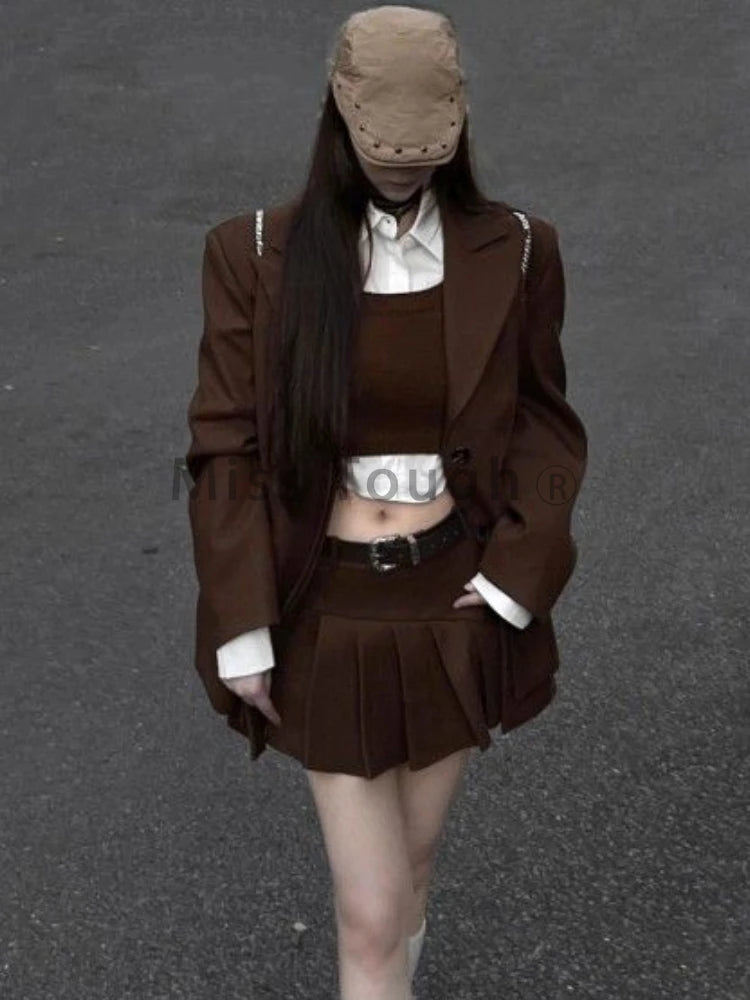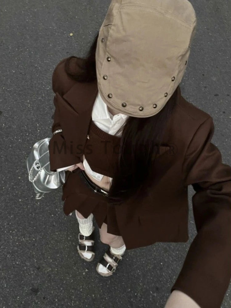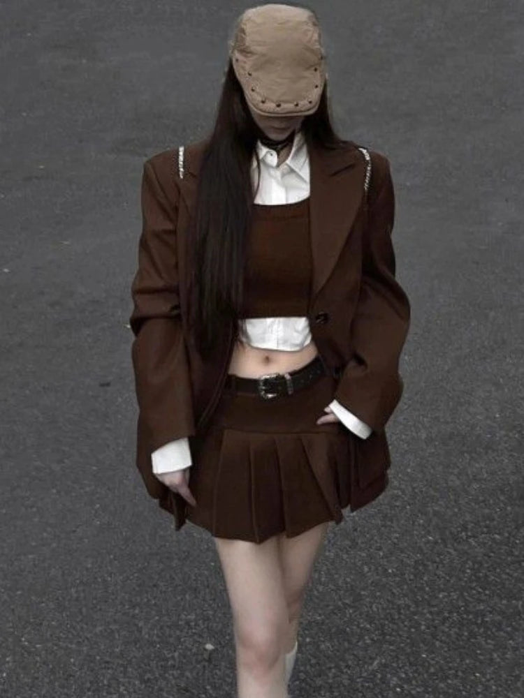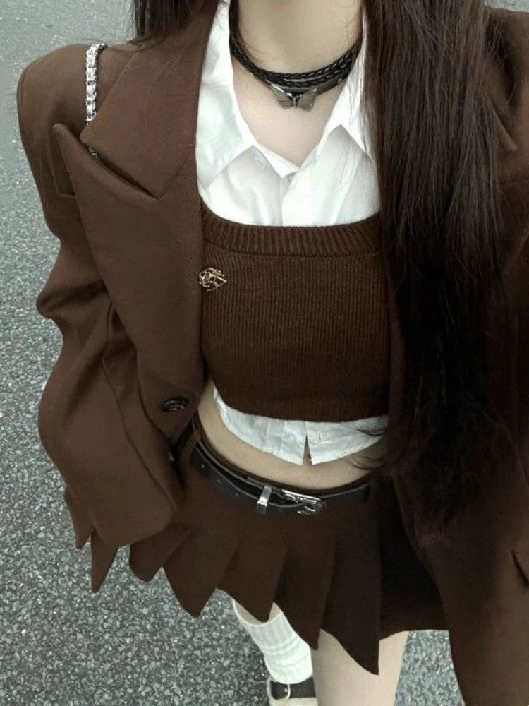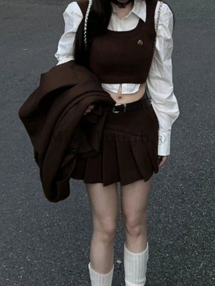 GETADME Fashion Vintage Loose Knit 4 Pieces Set Women Design Elegant Solid Lapel Long Sleeve Tops Female + High Waist Ruffle Short Skirt
