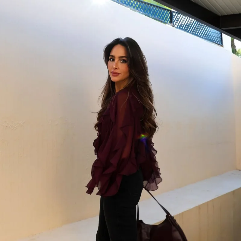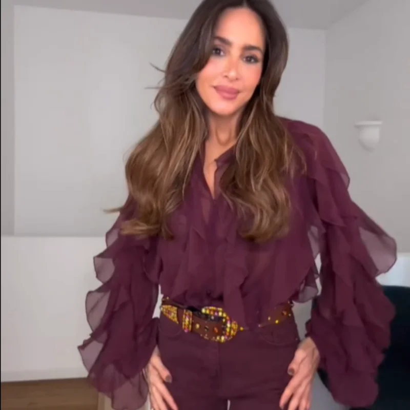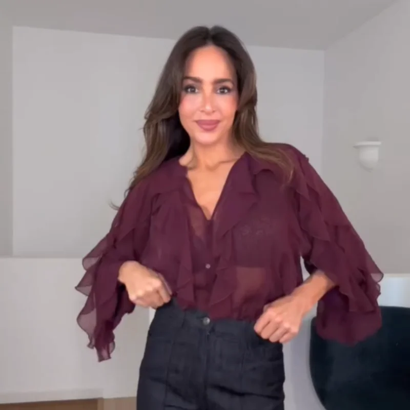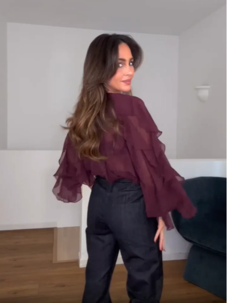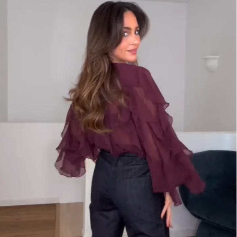 GETADME fashion women v neck ruffles lantern long sleeve shirt elegant solid mesh single breasted blouse 2025 commute high street outfit