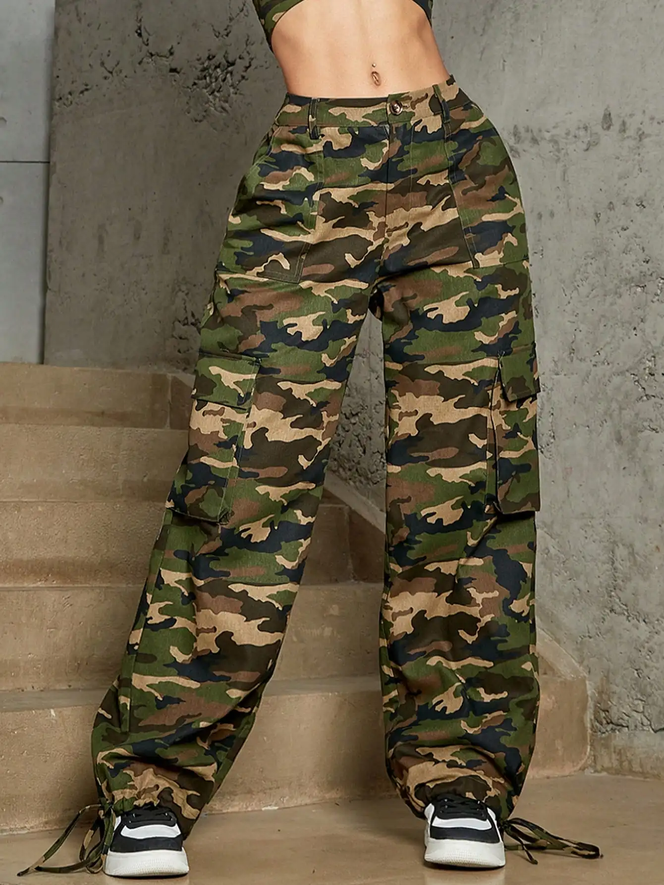 GETADME Fashionable and casual multi pocket tied loose wide leg work pants