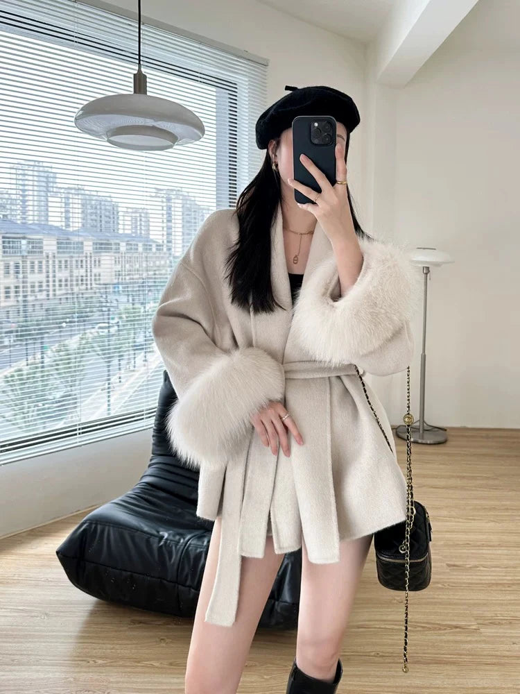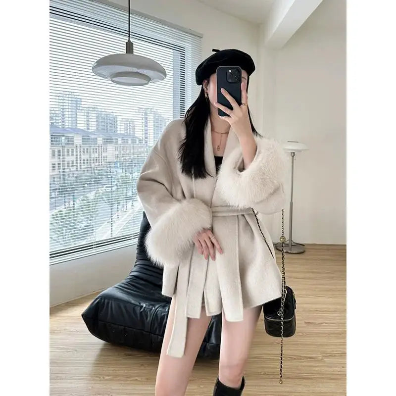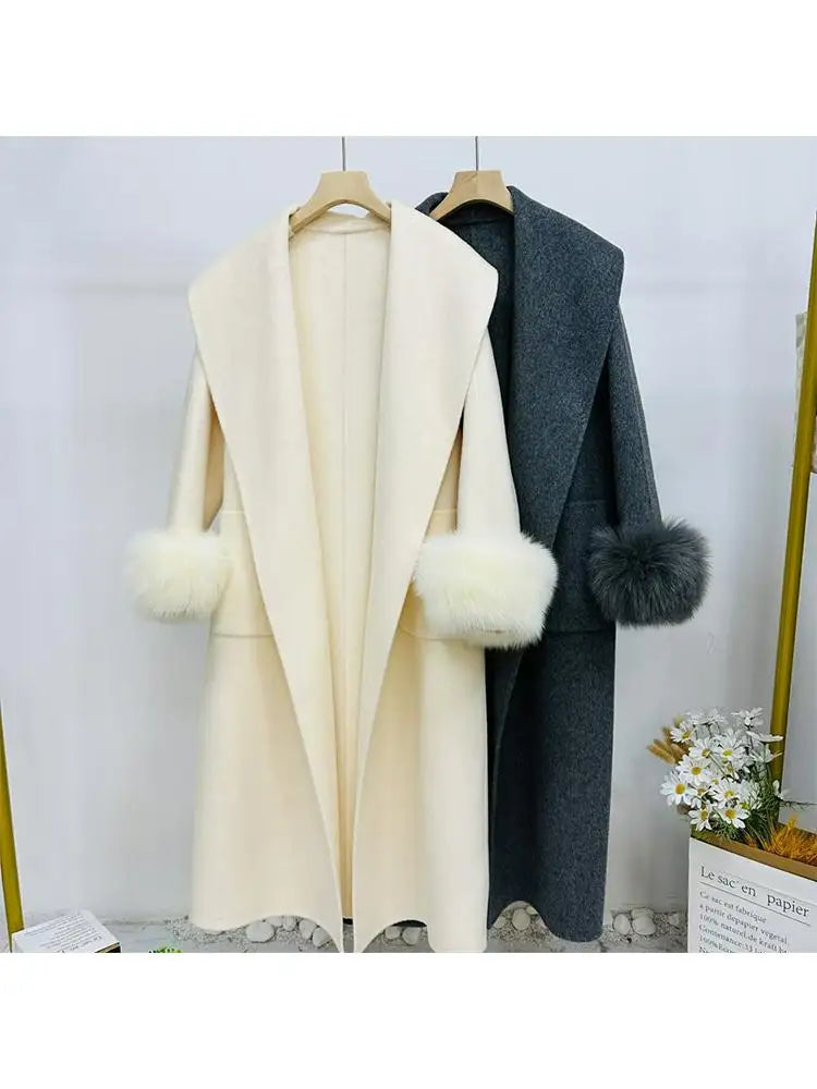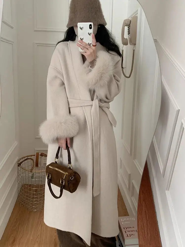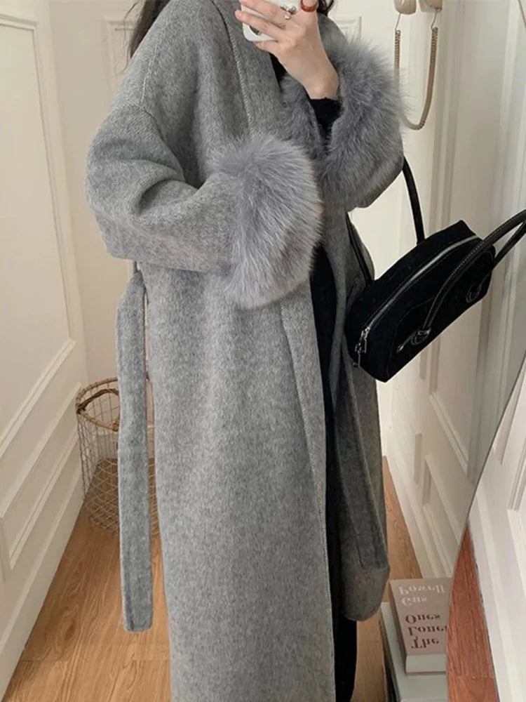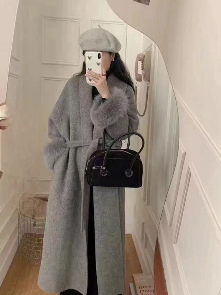 GETADME Fox Fur Sleeve Female Lady Woolen Jackets 2025 Autumn And Winter Celebrity Elegant Double-Sided Lace Up Long Women's Wool Coats