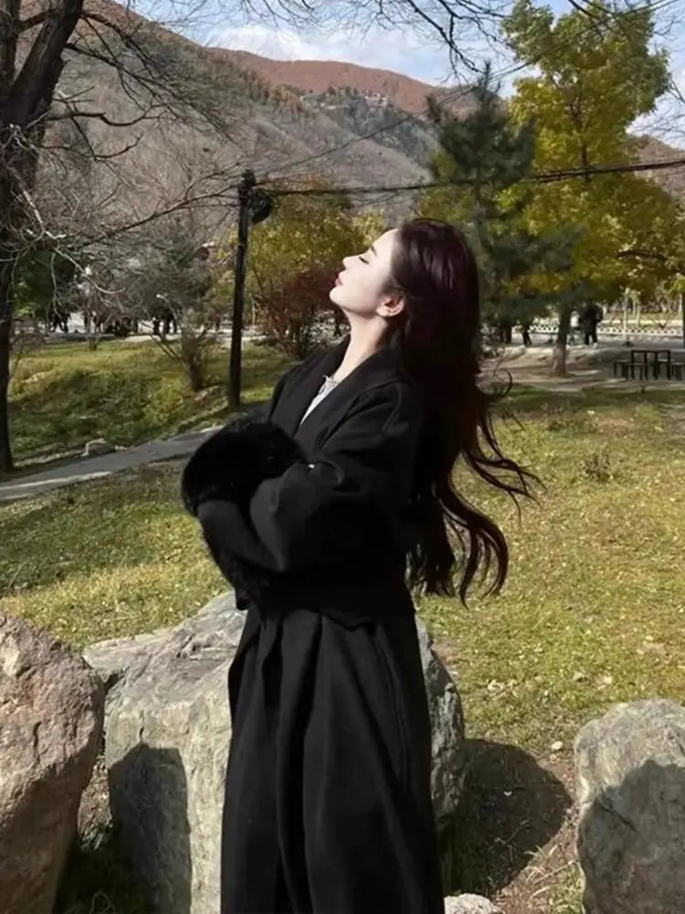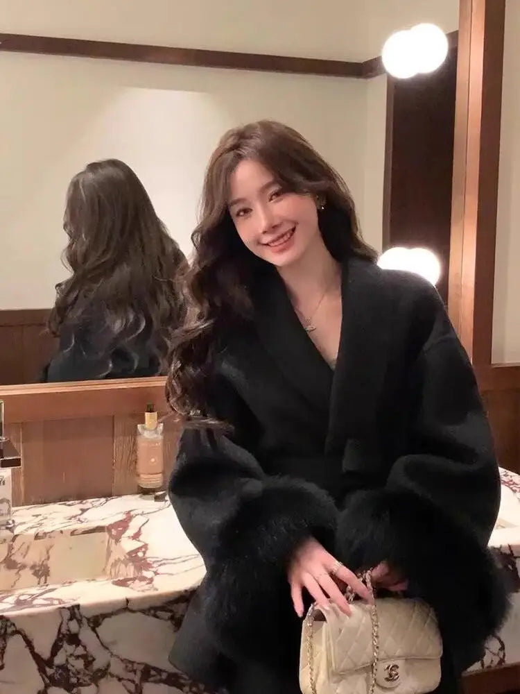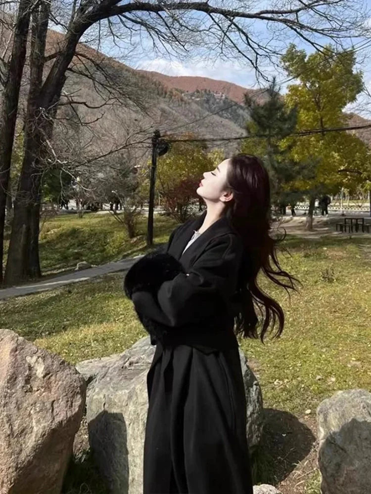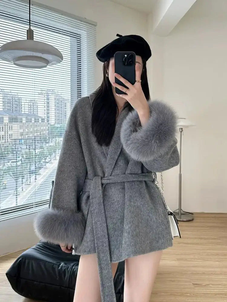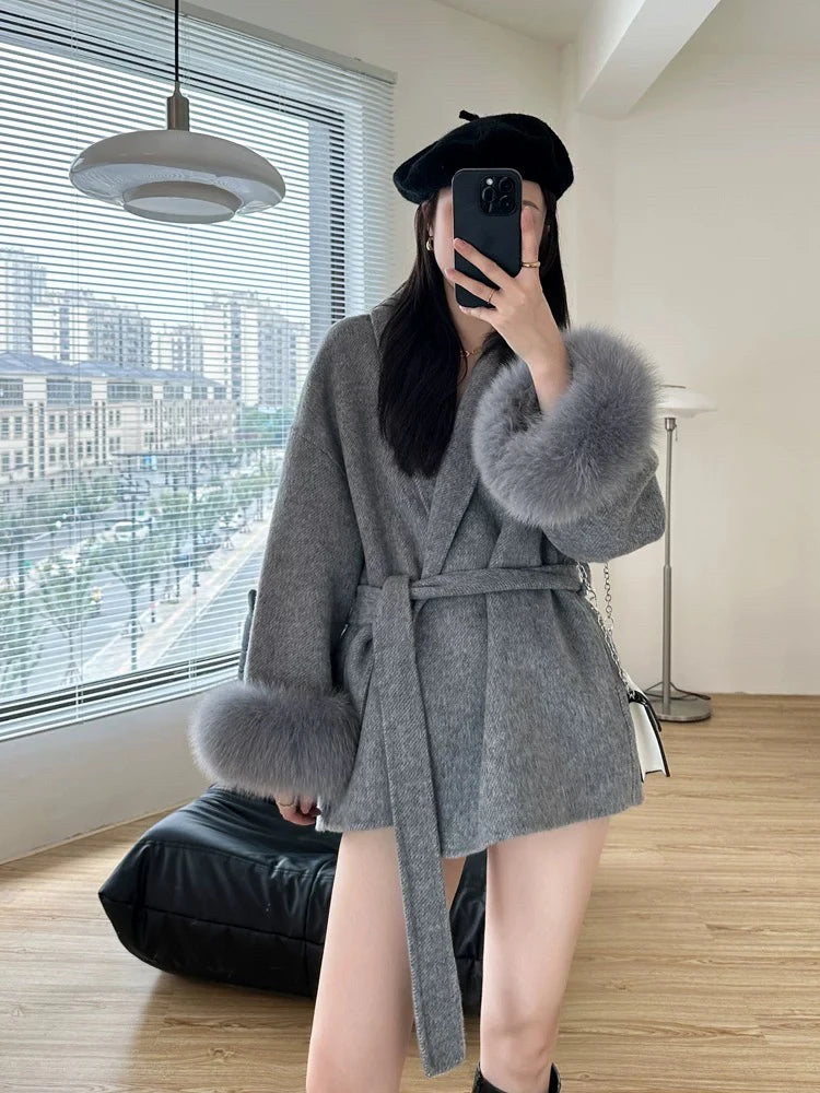 GETADME Fox Fur Sleeve Female Lady Woolen Jackets 2025 Autumn And Winter Celebrity Elegant Double-Sided Lace Up Long Women's Wool Coats