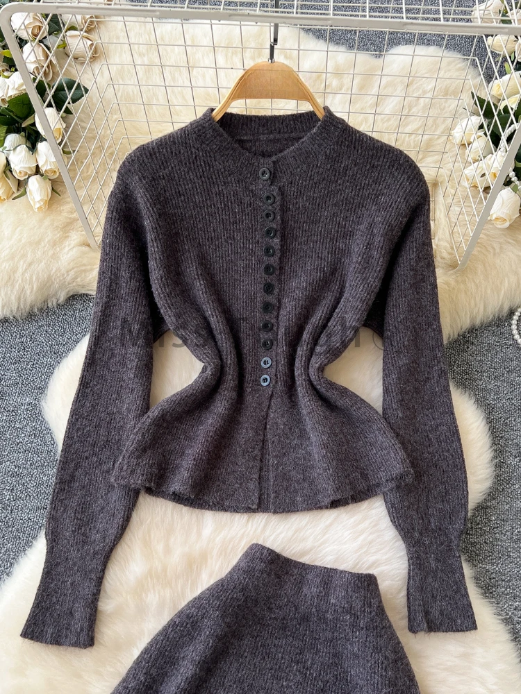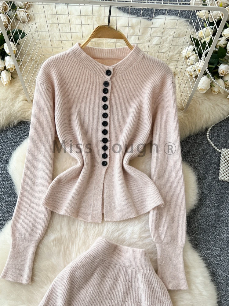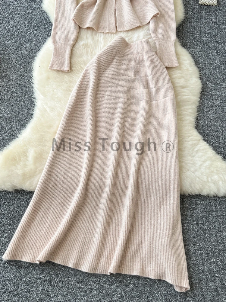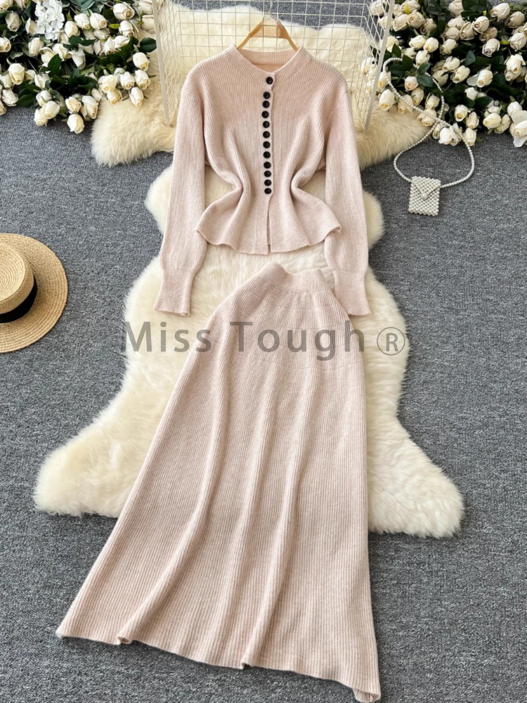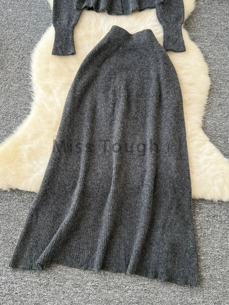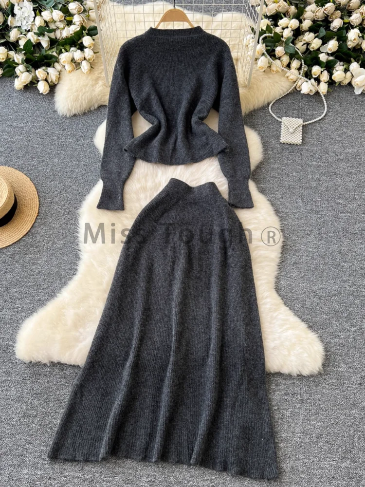 GETADME French Elegant Retro Knitted Two Piece Set Women Casual Sweater + High Waist Long Skirt Autumn Vintage Solid Slim Suit New 2025