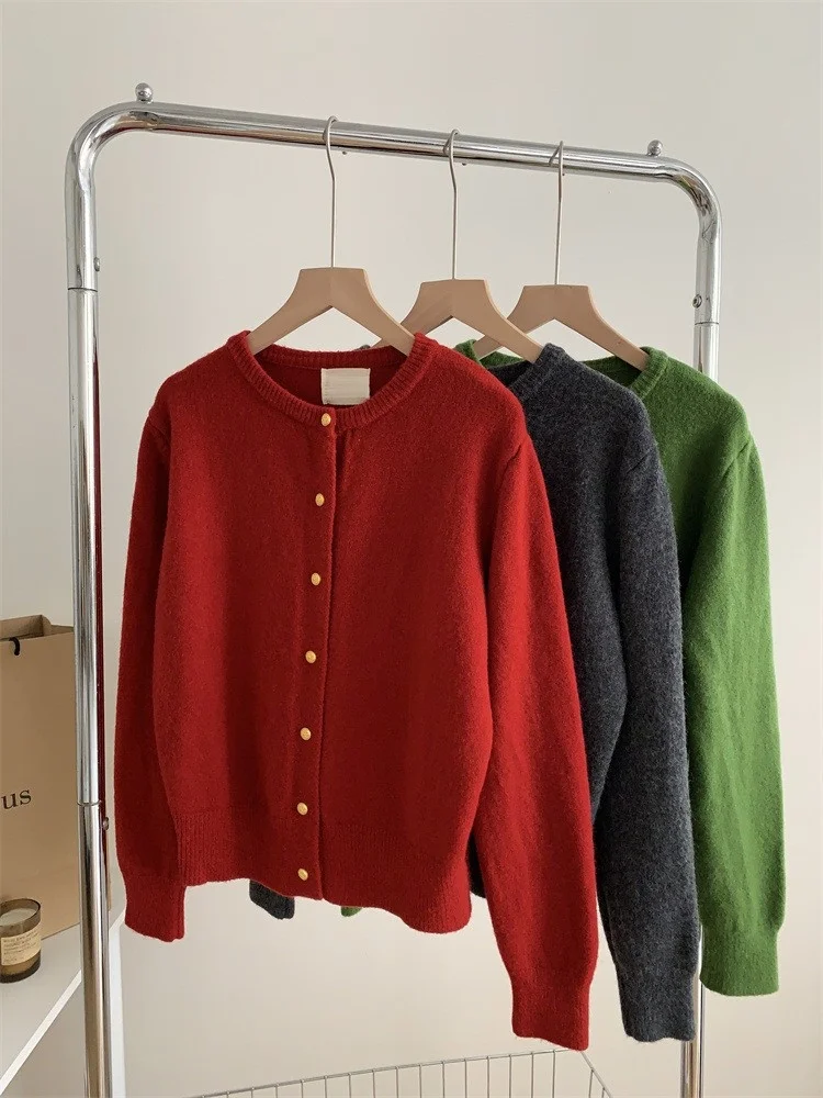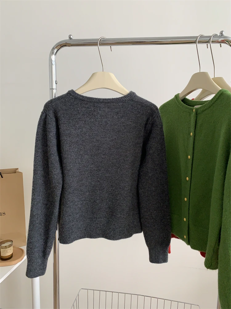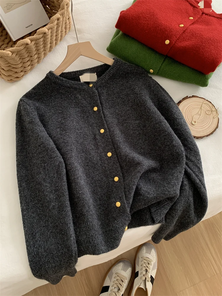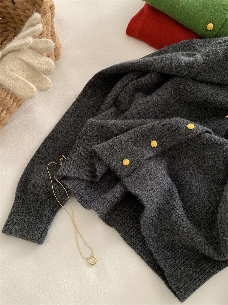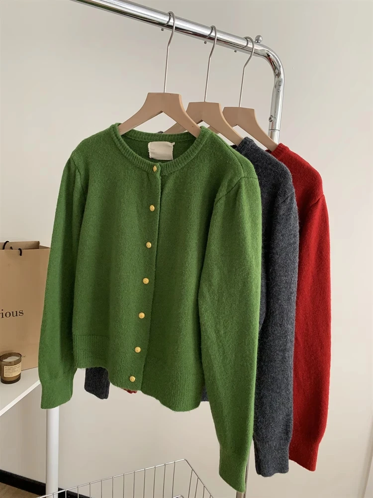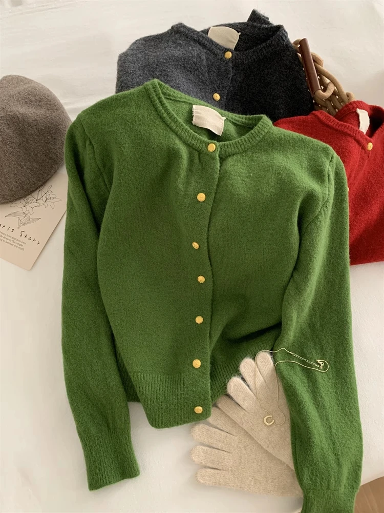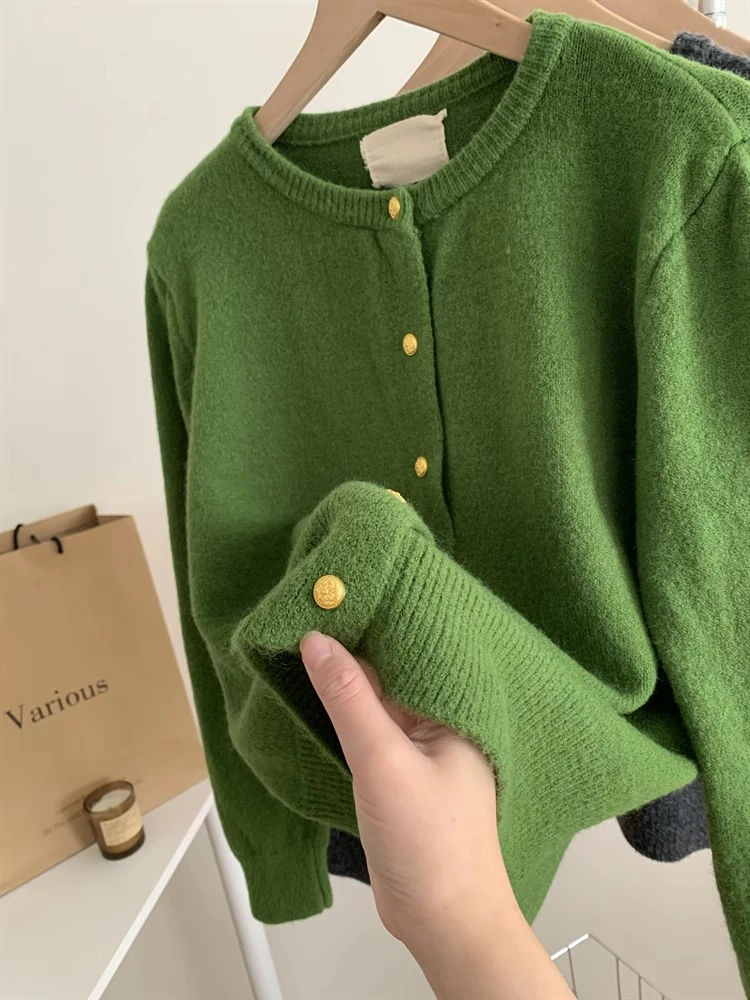 GETADME French Elegant Small Gold Button Knitted Cardigan 2025 Autumn/Winter Women's Green Round Neck Sweater Loose All-matched Jacket