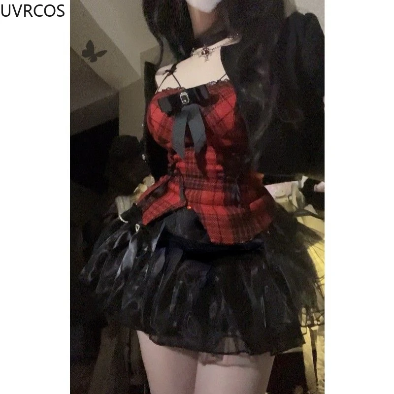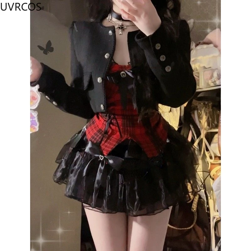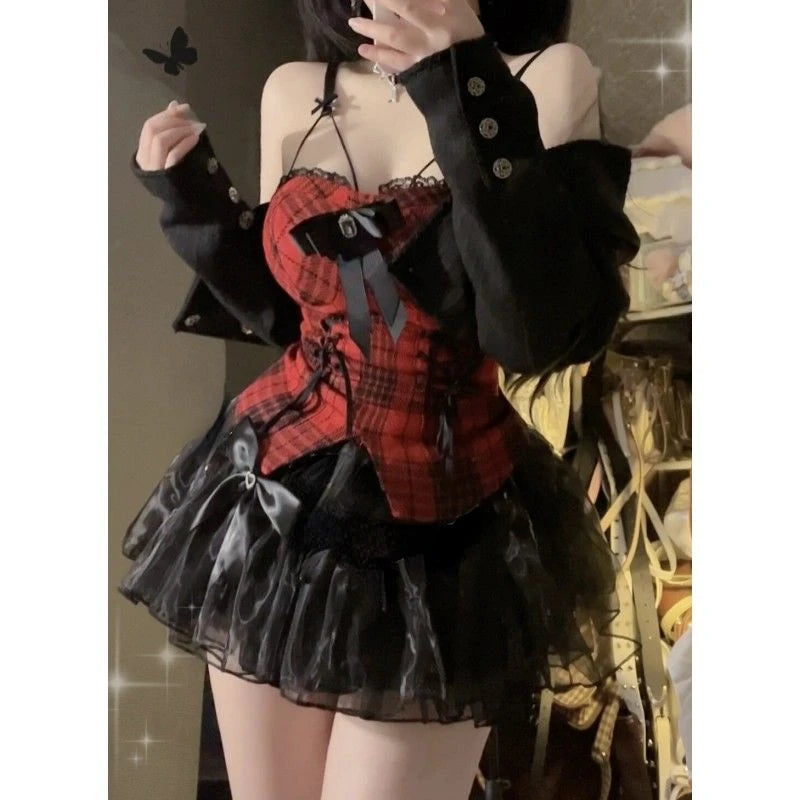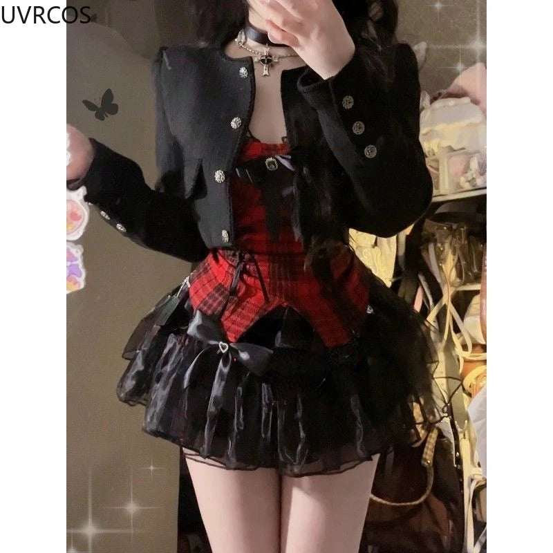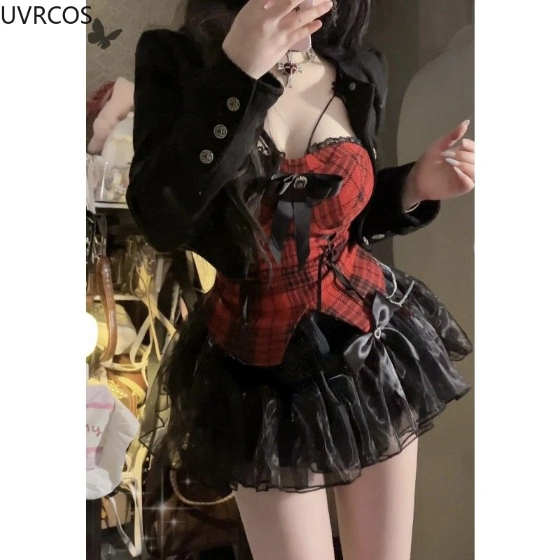 GETADME Gothic Y2k Lolita 3 Piece Set Women Sexy Bow Plaid Vest Short Jackets Mesh Mini Skirts Female Japanese Fashion Punk Outfit 2025