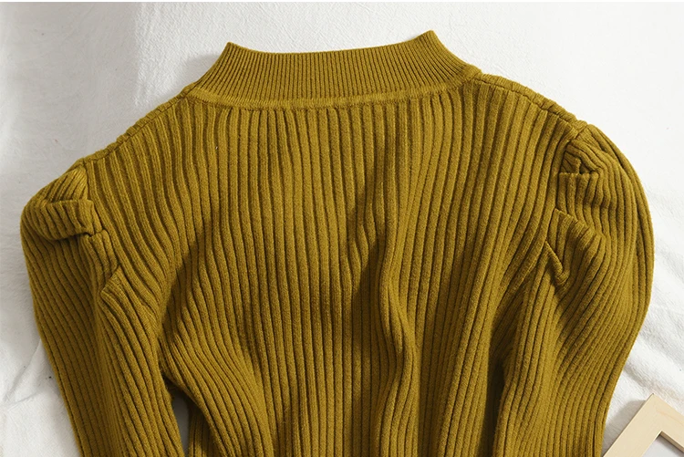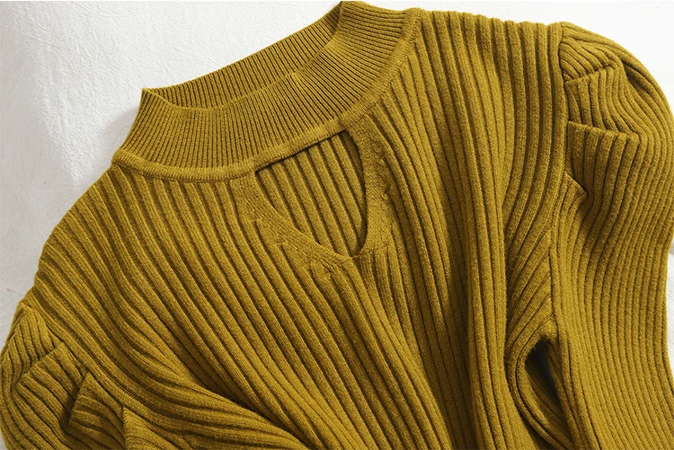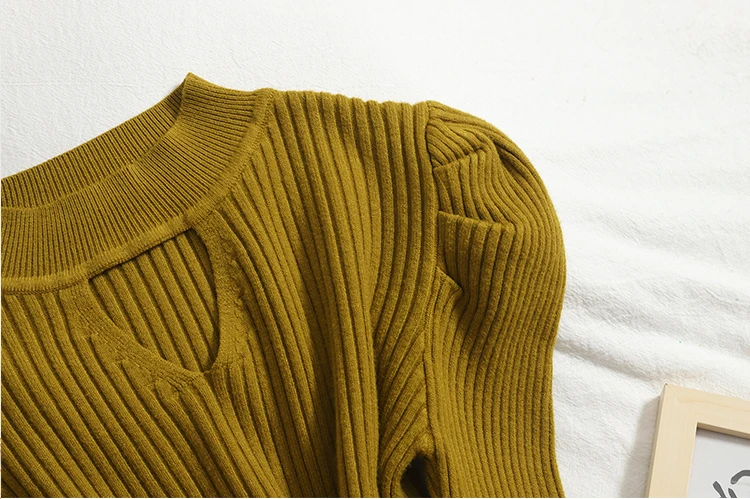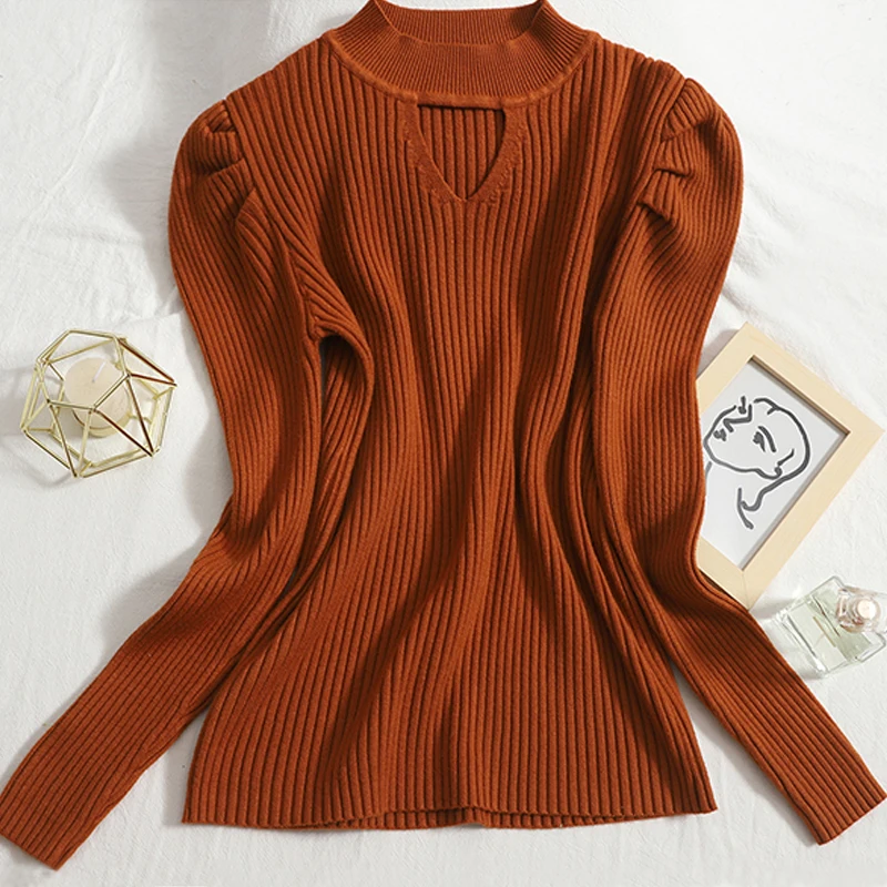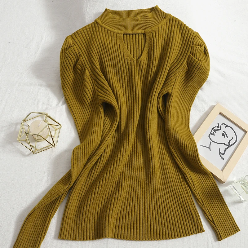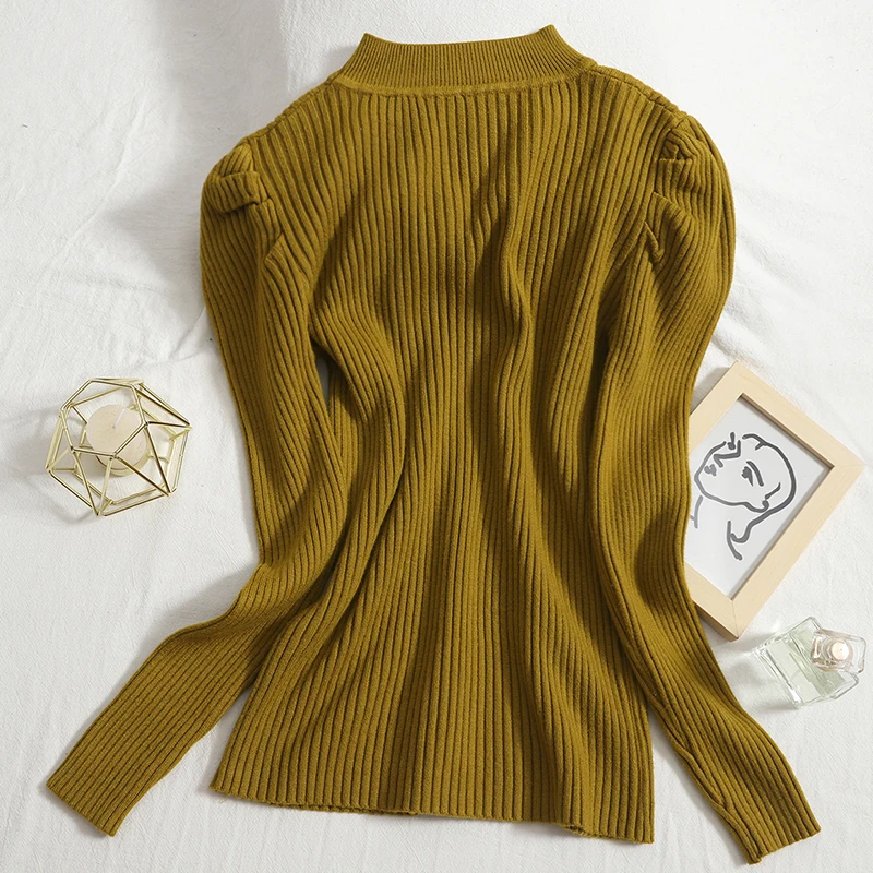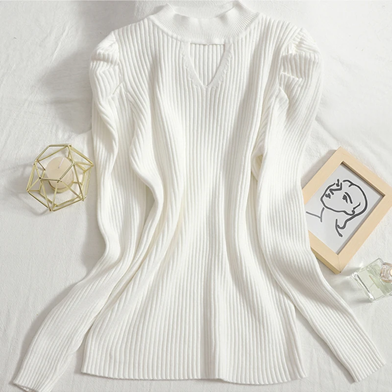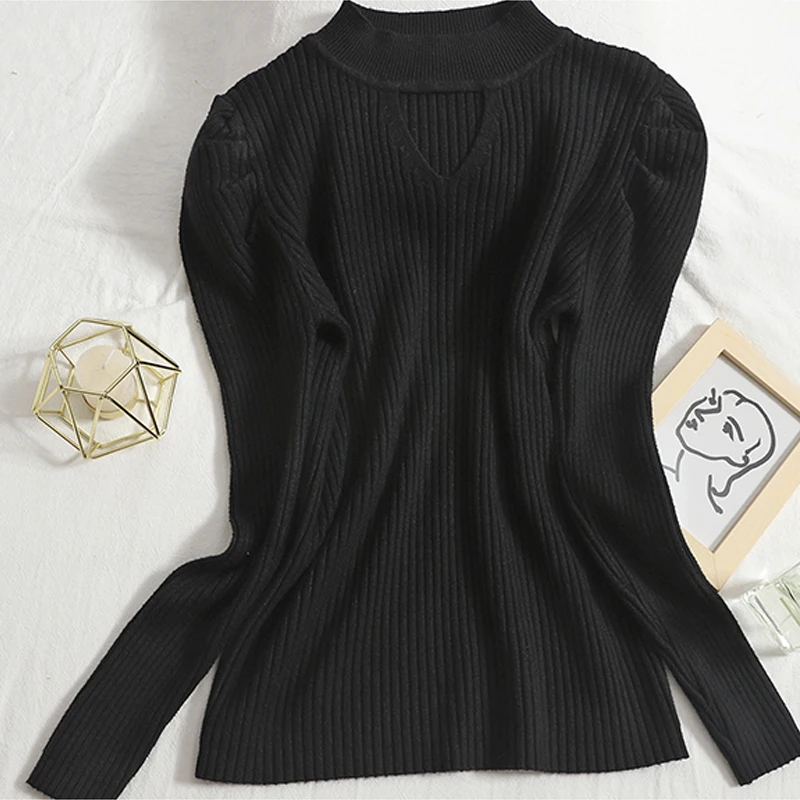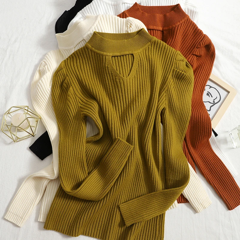 Half Turtleneck Hollow Knitted Sweater Slim Fit Elastic Puff Sleeve Bottoming Shirt 2022 Winter Solid Color Top