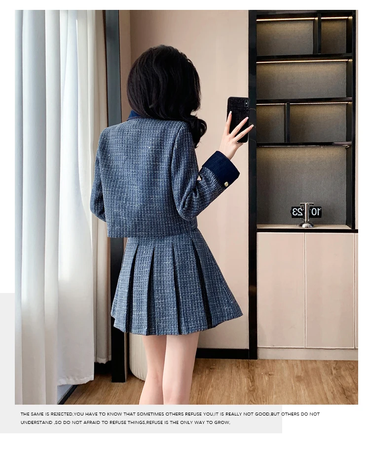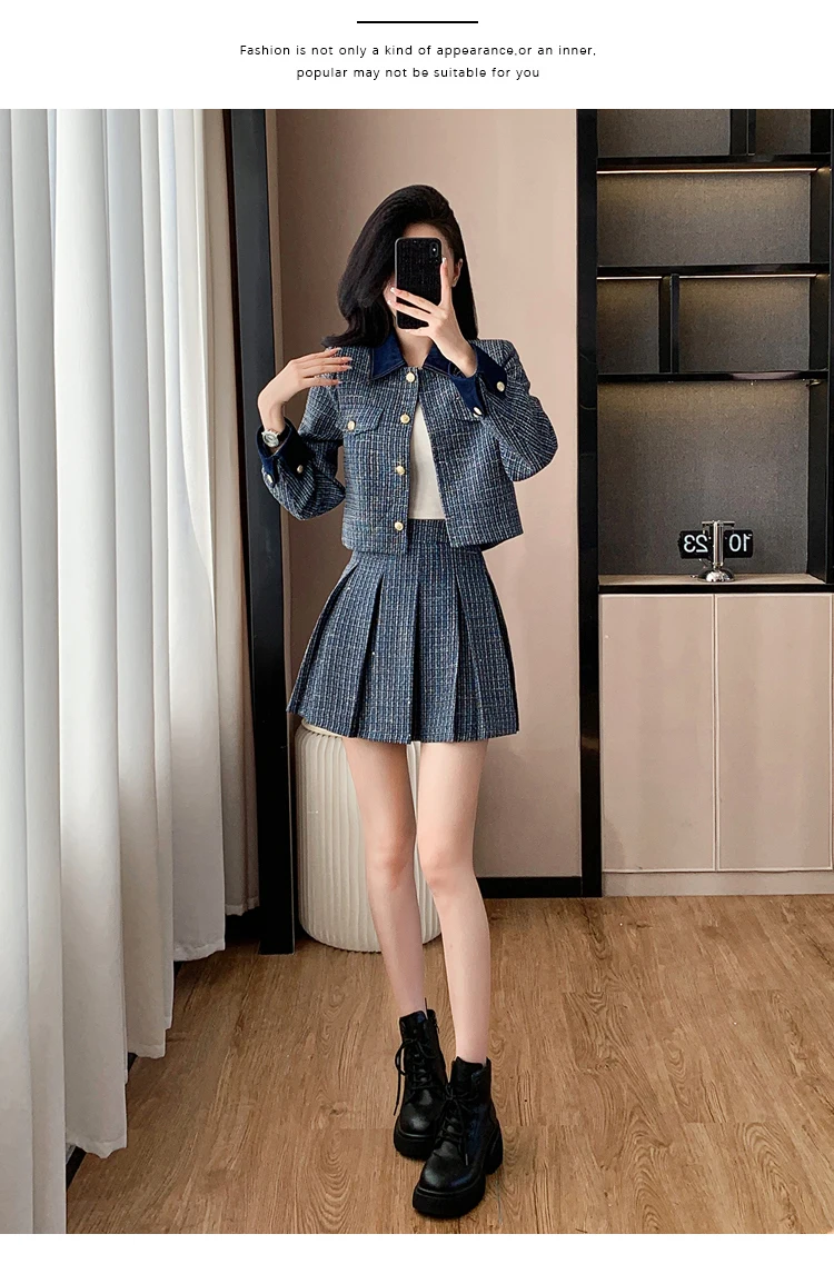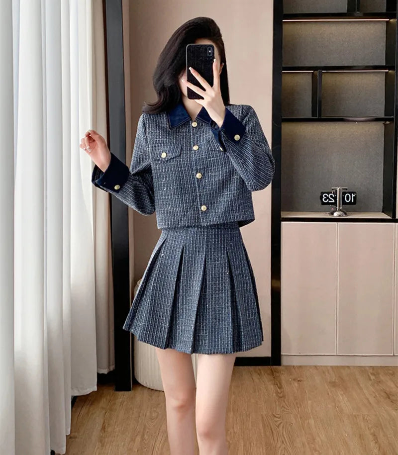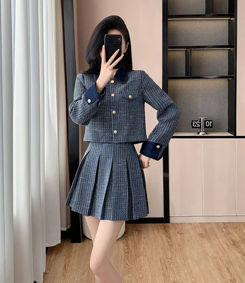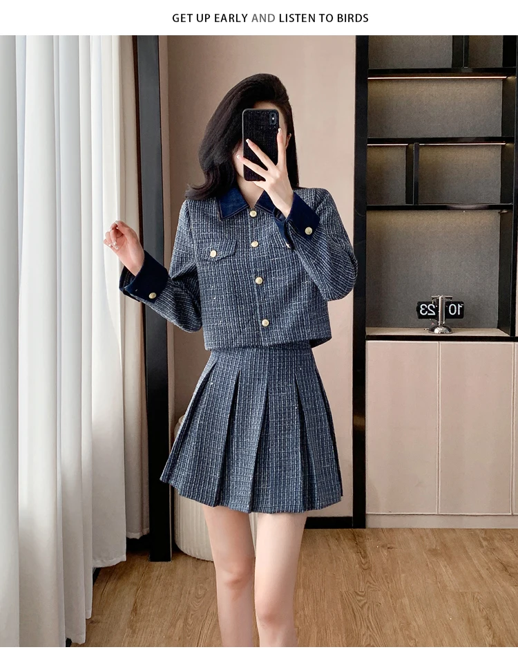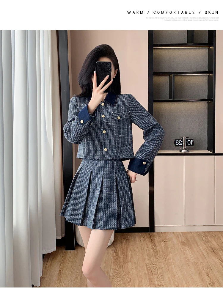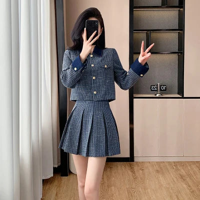 GETADME High Quality French Small Fragrance Autumn Tweed Denim Women Short Jacket Coat + Pleated Skirt Suits Luxury Brand 2 Piece Set