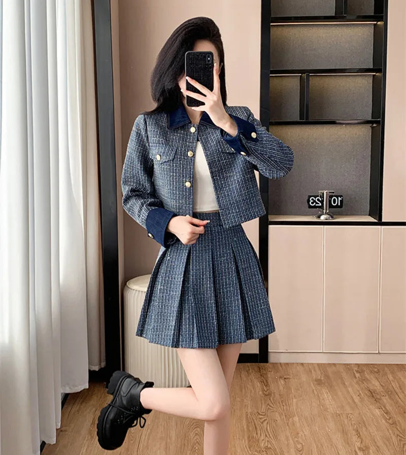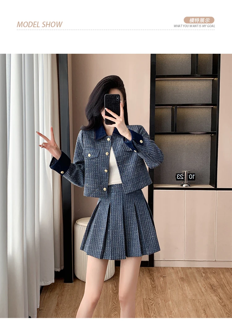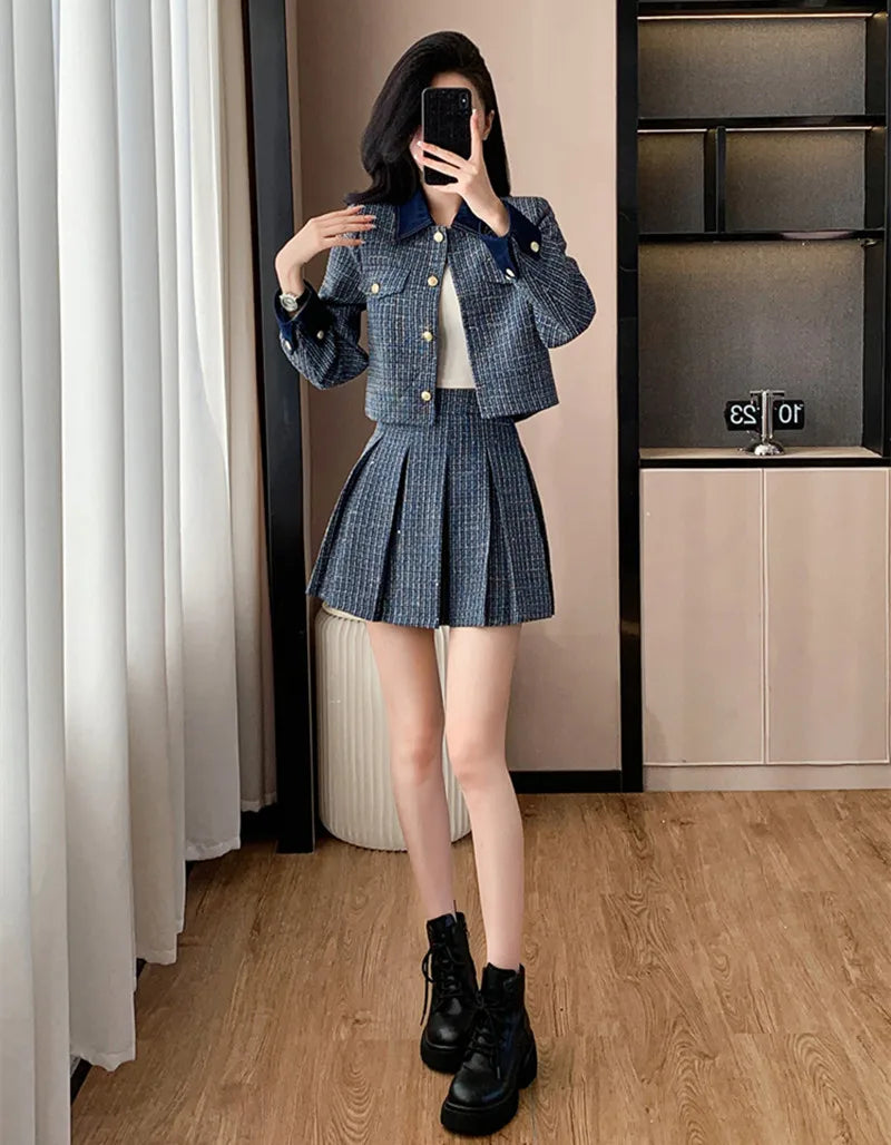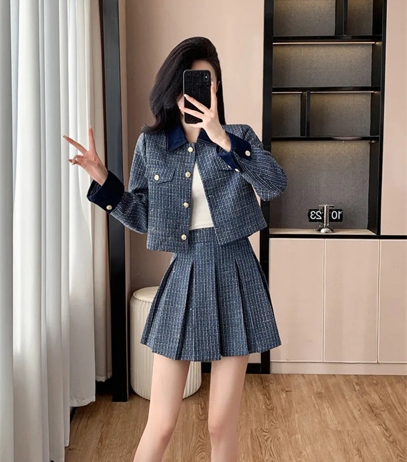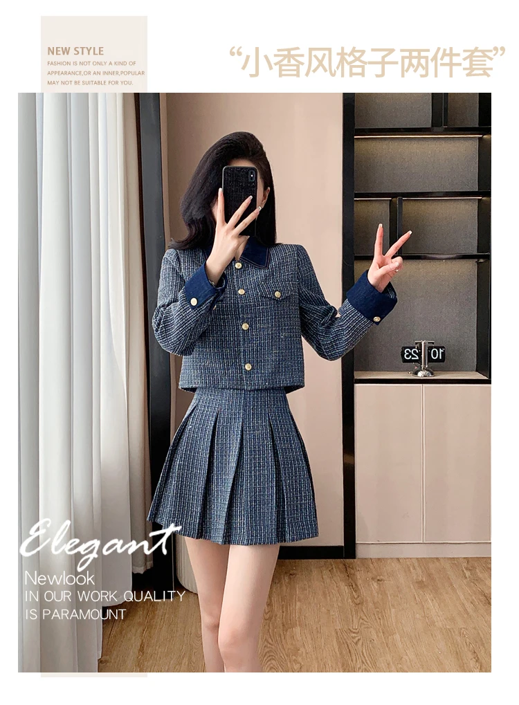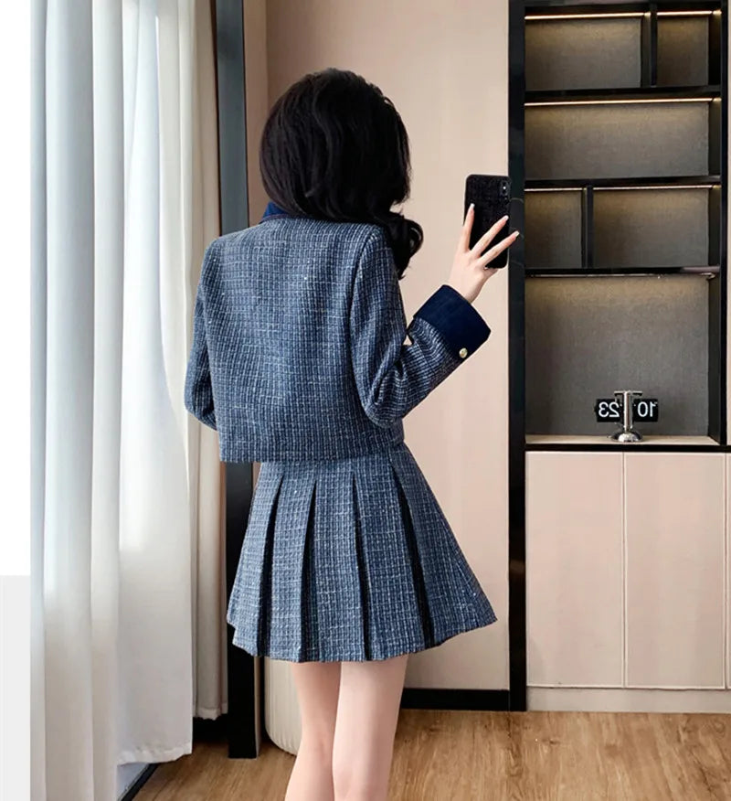 GETADME High Quality French Small Fragrance Autumn Tweed Denim Women Short Jacket Coat + Pleated Skirt Suits Luxury Brand 2 Piece Set