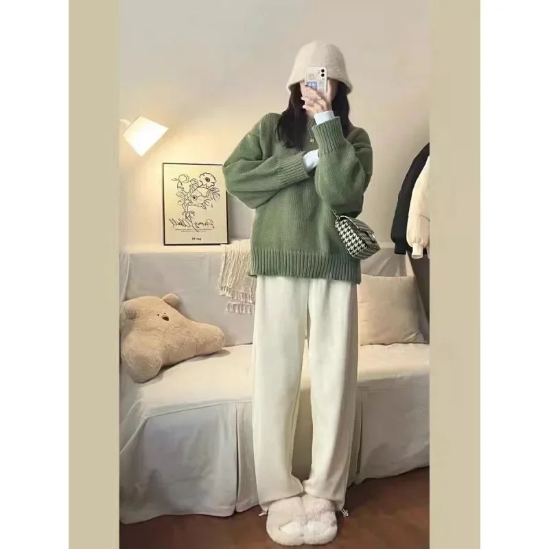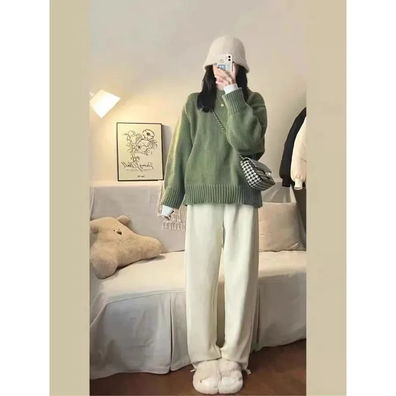 GETADME Japanese Vintage Green Round Neck Pullover Sweater Women's Loose Fit Casual Style Thickened Autumn Winter Outerwear Knit Top