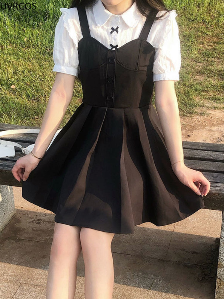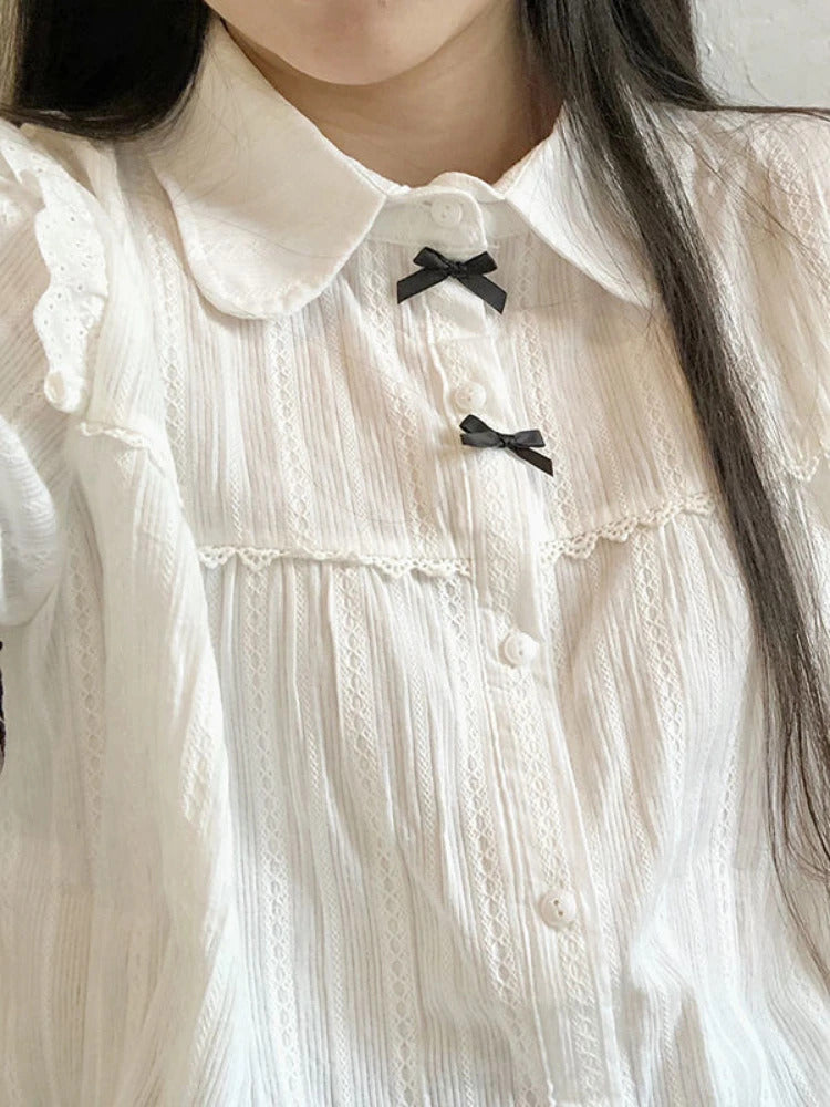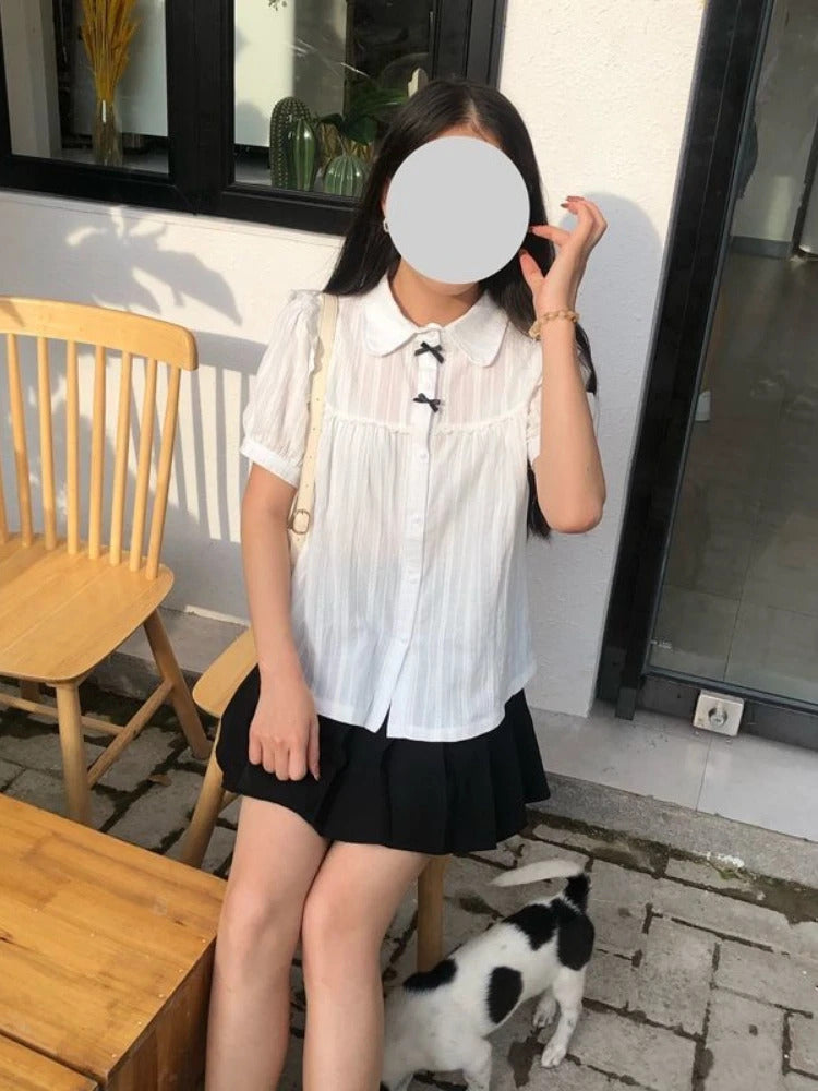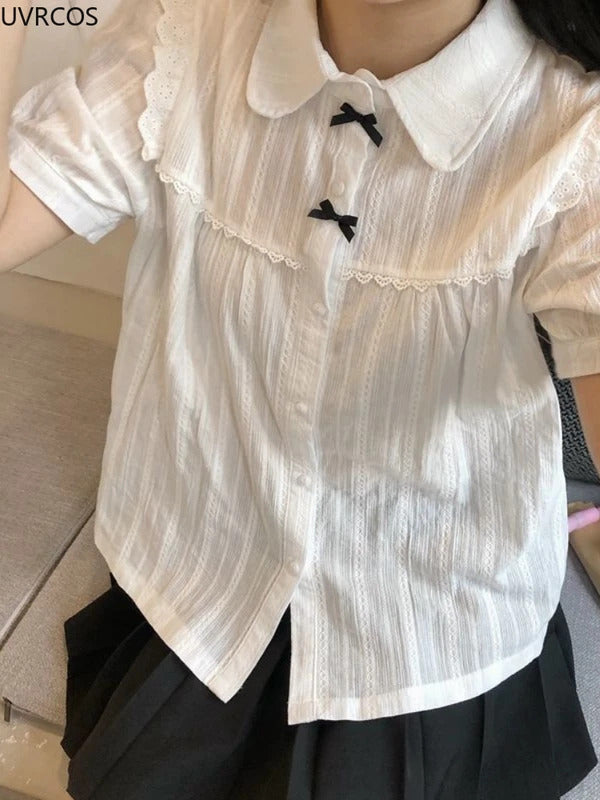 GETADME-Kawaii White Lolita Lace Blouse Women Gothic Preppy Style Vintage Peter Pan Collar Short Sleeve Shirt Girl Summer Cute Top Mujer