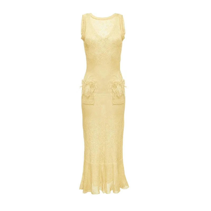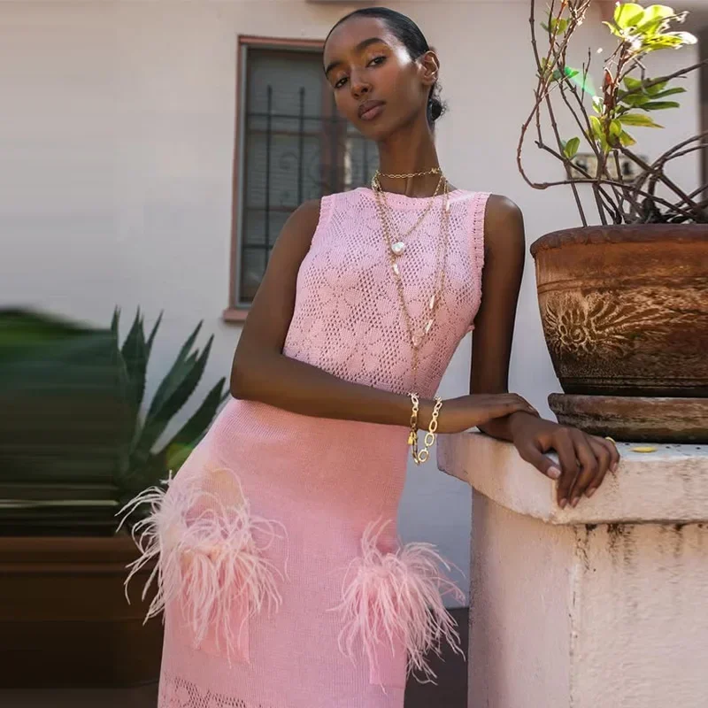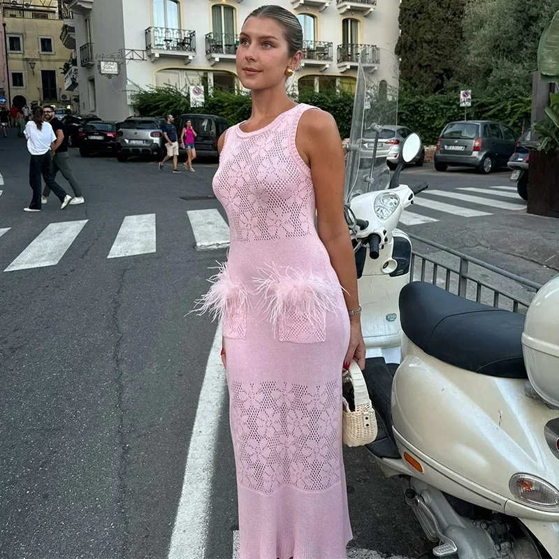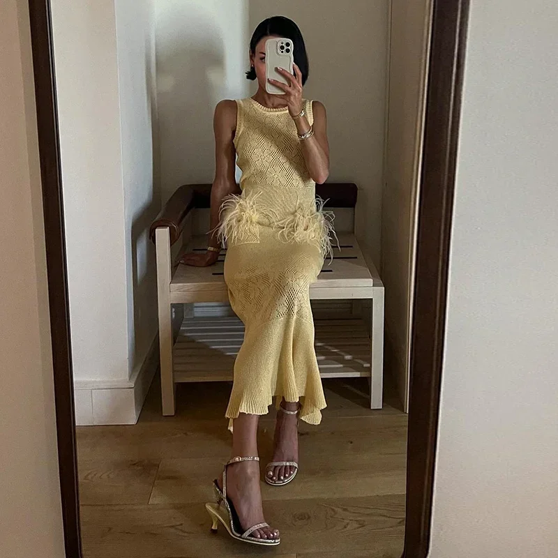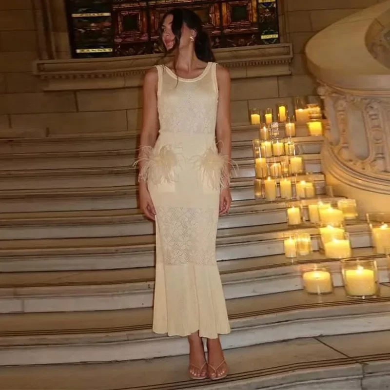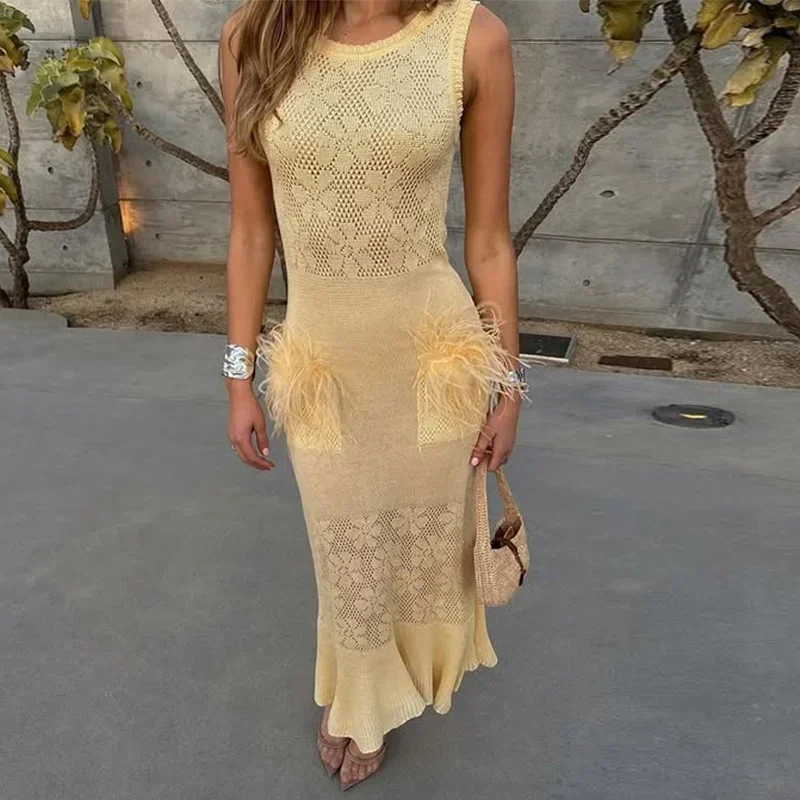 GETADME Knitted Feather Mermaid Dress Women Elegant Hollow Out Sleeveless Long Party Dresses Female 2025 Summer Spliced Beach Robes Lady