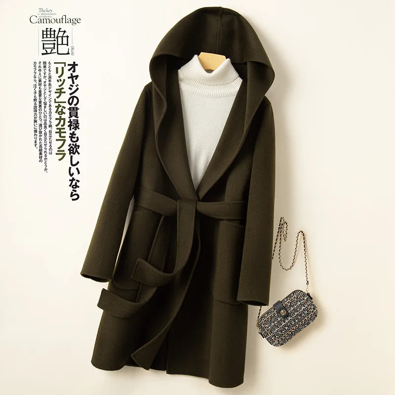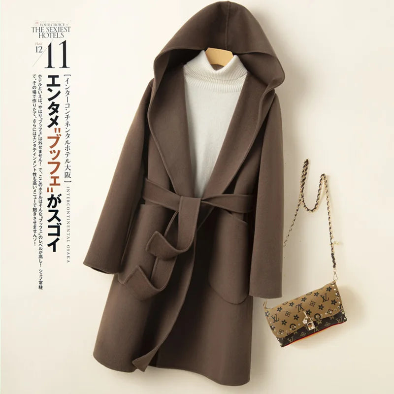 GETADME Korean Design Women Double-sided Cashmere Mid-length Hoodie Coat With Belt Lace Up Hooded Slimming Wool Jacket Autumn Winter