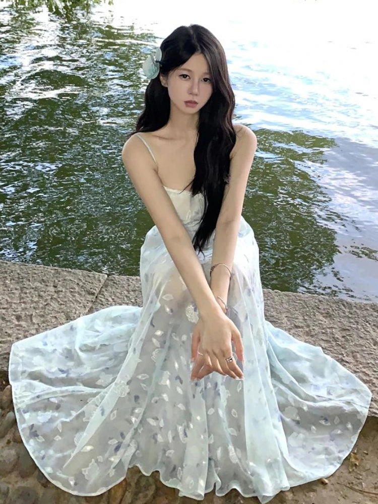 GETADME Korean Maxi Printing Dresses for Women 2025 Vestidos De Mujer Slim Waist Temperament Robe Femme Fashion Sexy Summer Slip Dress