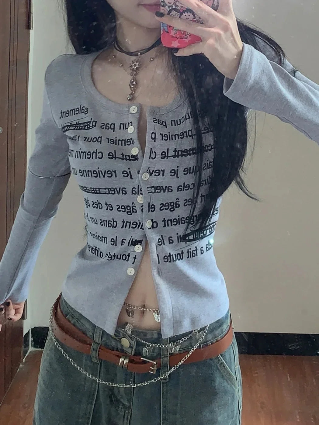 Getadme-Korean Style Vintage Gray Crop T Shirts Women Streetwear Letter Print Casual Tops Mujer Slim Long Sleeve Tees Autumn