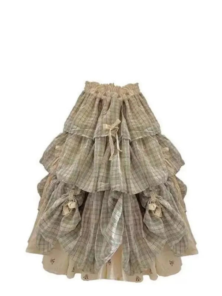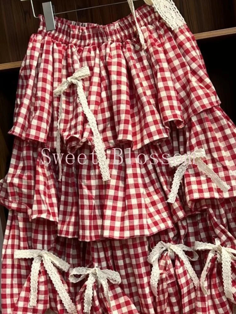 GETADME Korean Sweet Fit Chic Plaid Patchwork Skirt Women New Fashion Vintage Bow Print Fluffy Skirts Harajuku Y2k Lovely Clothes Spring