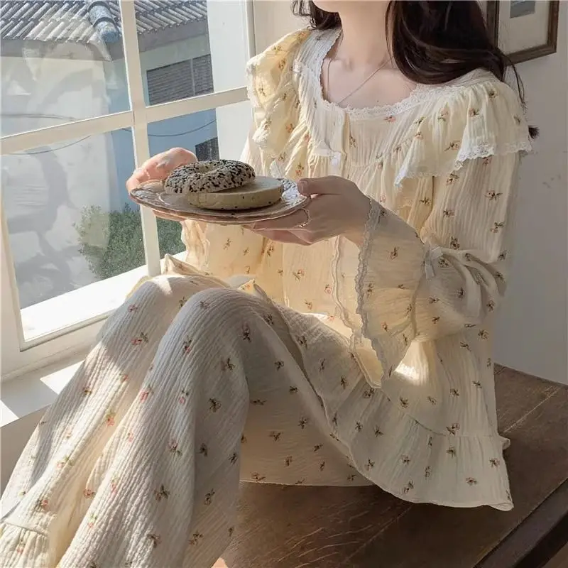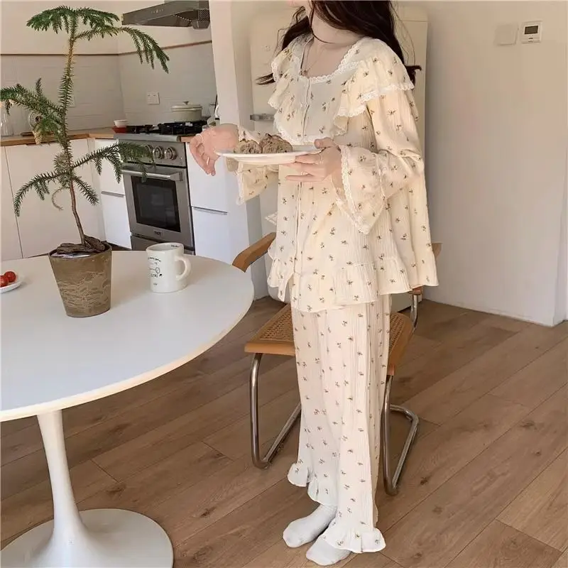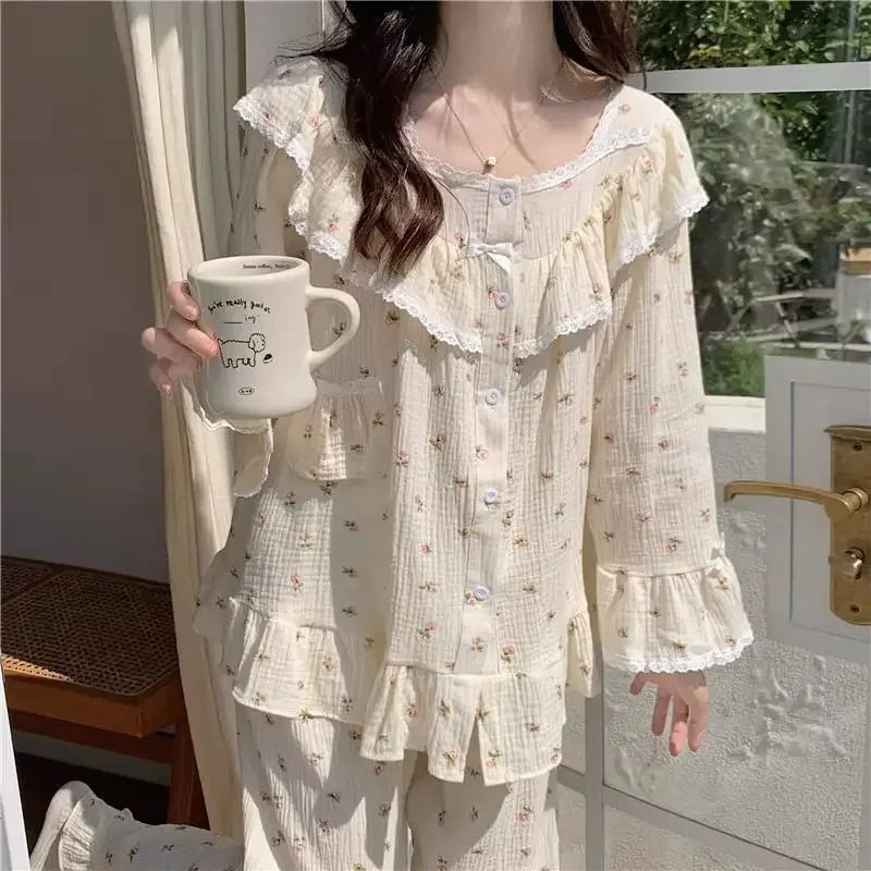 GETADME Lace Sleepwear Women Pajama Sets Floral Piiama Spring Sets 2 Pieces Korean Long Sleeve Night Wears Sleep Button Ruffle Home Suit