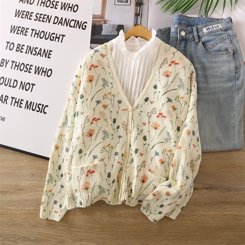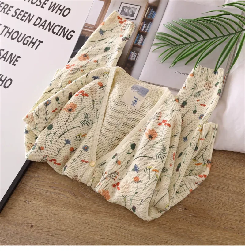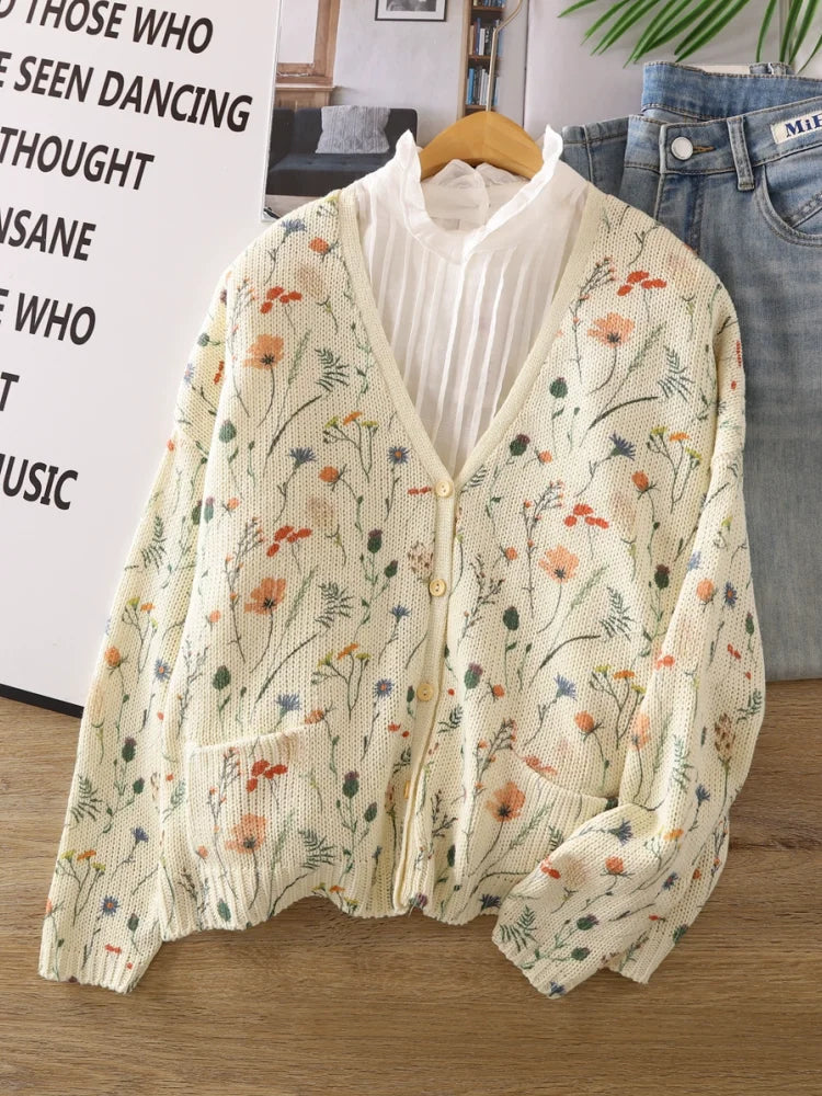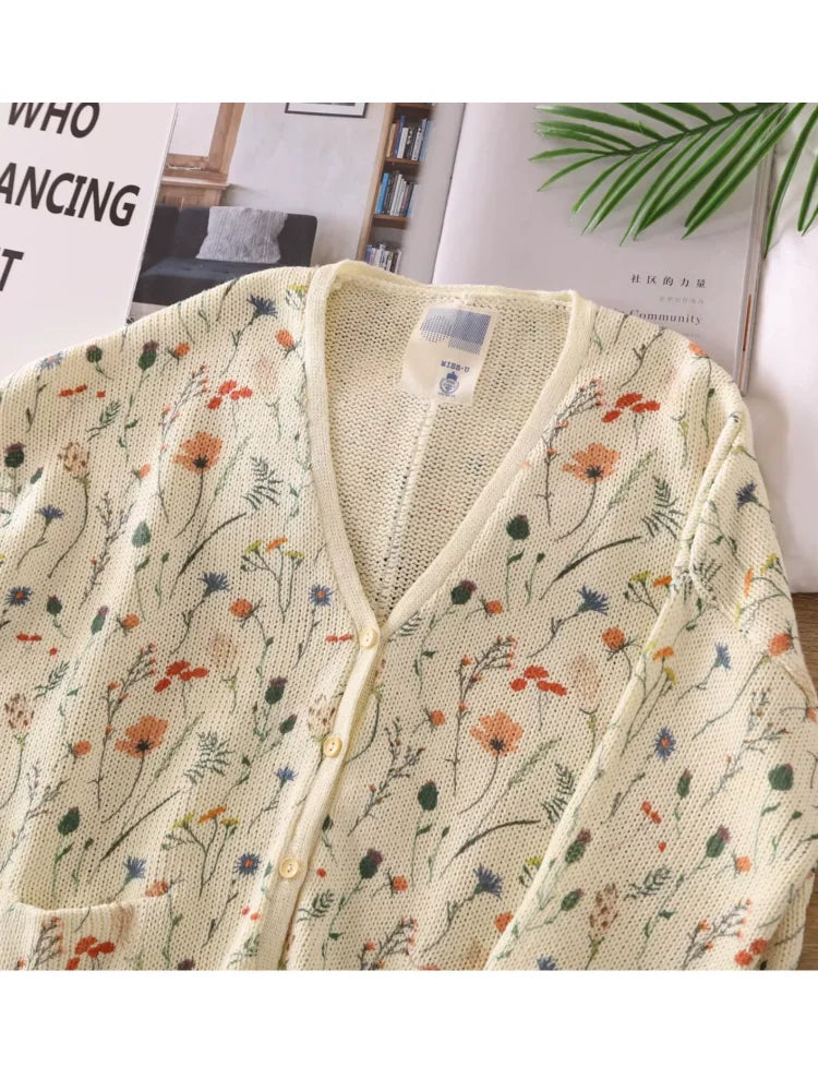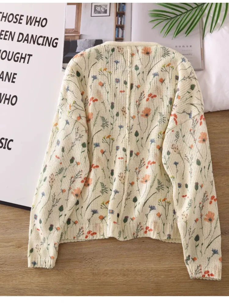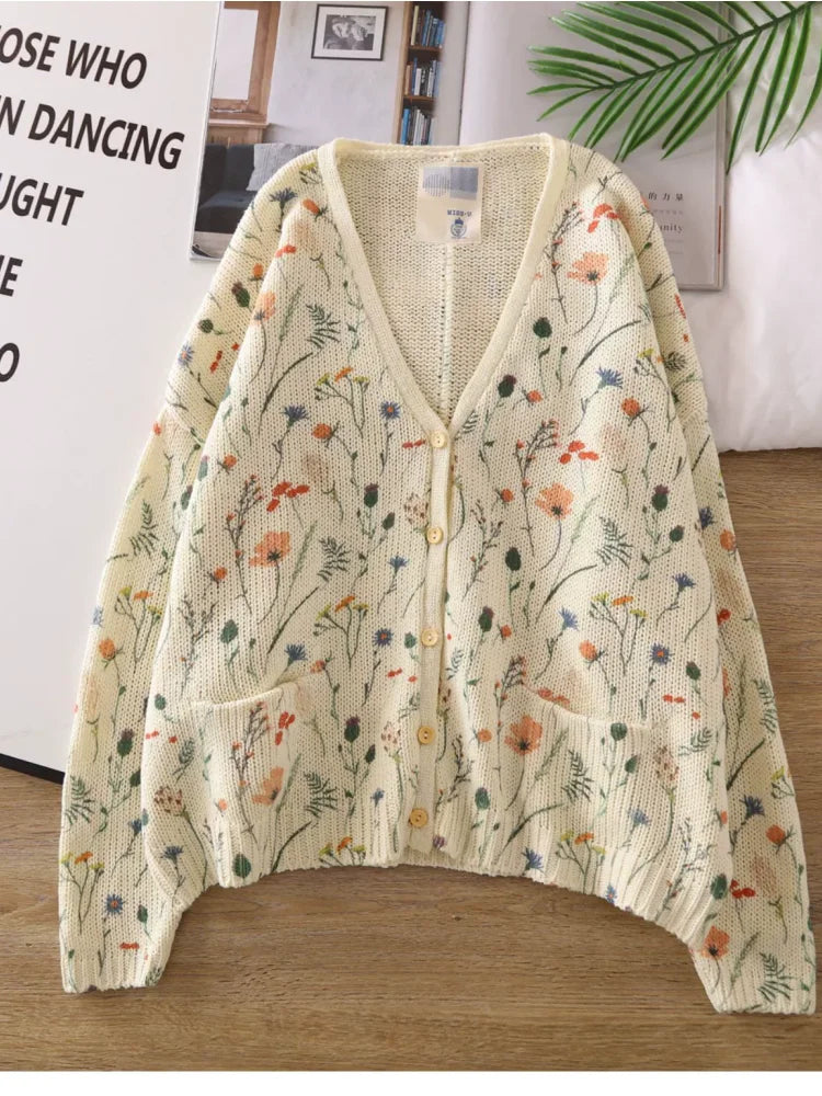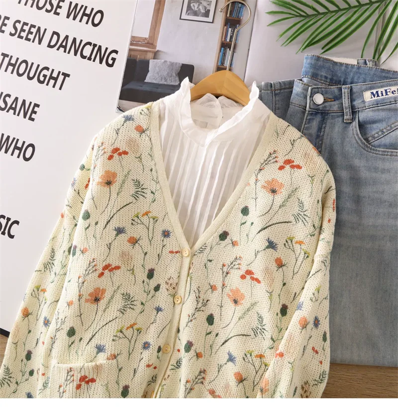 GETADME Lamtrip Kawaii Colorful Wheat Flowers Print Sweet V-Neck Cardigan Knitted Sweater