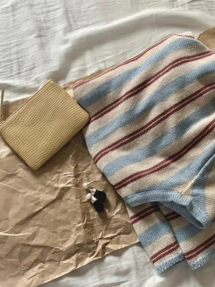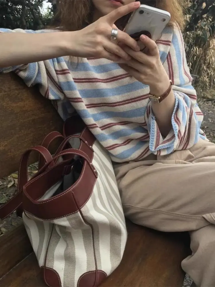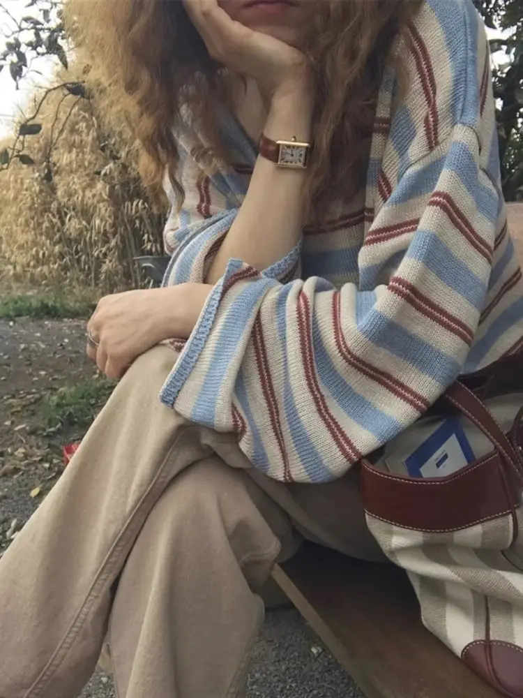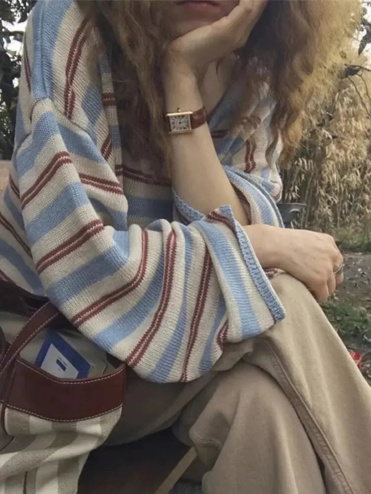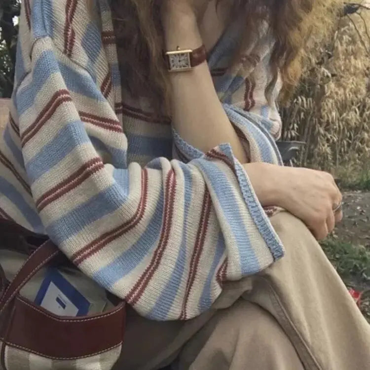 GETADME Lazy Striped V-neck Long-sleeved Knitted Tops Women 2025 Autumn New Bottoming T-shirts Y2k Long Sleeve Loose Tee Shirt