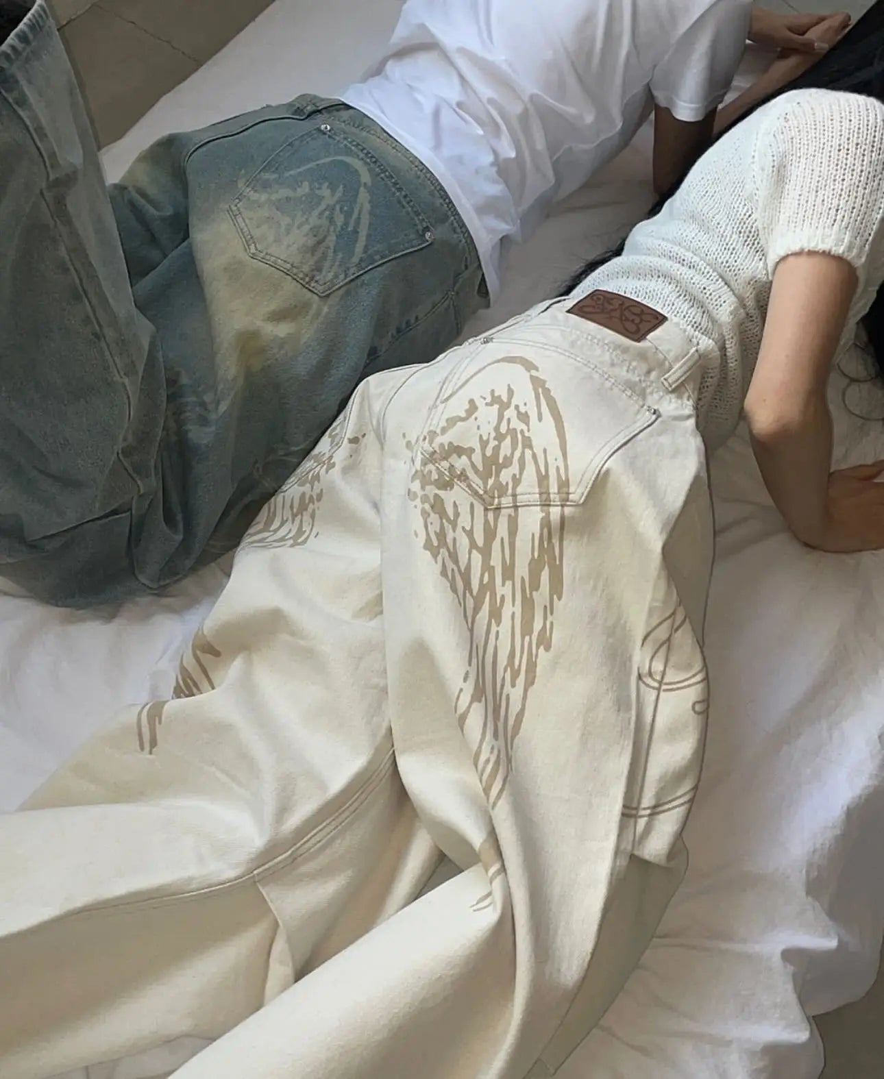GETADME Light Colour Trend Dressing Up Korean Style Simple Baggy Angel Printed Jeans 2025 Spring Necessary Solid Retro Straight Pants
