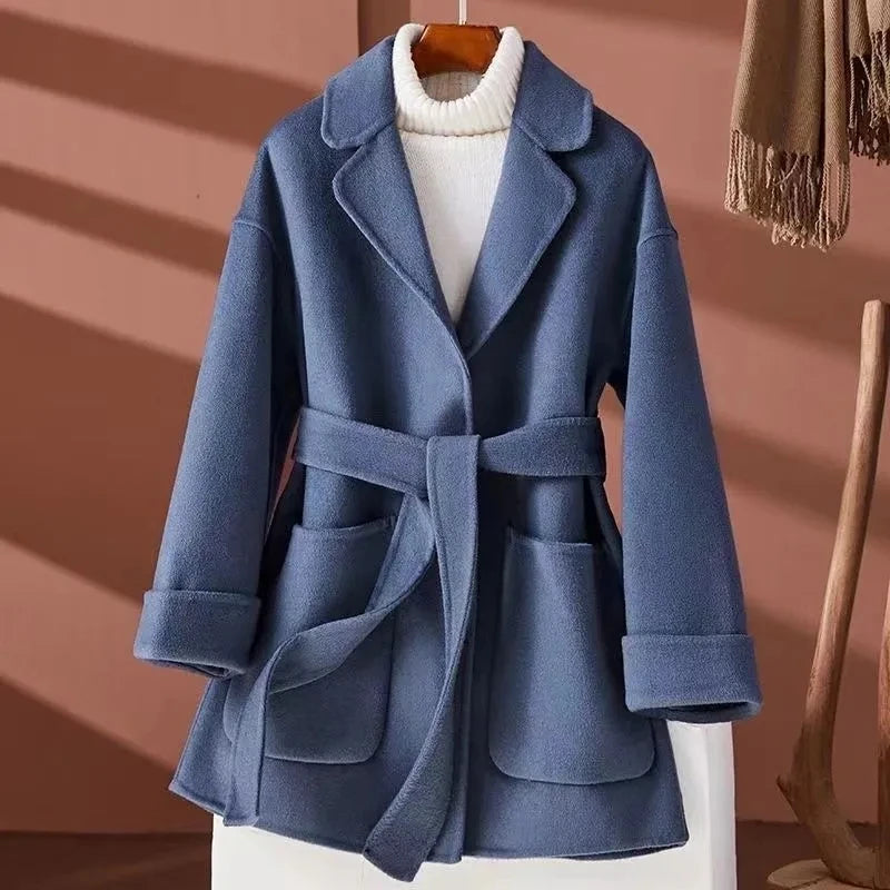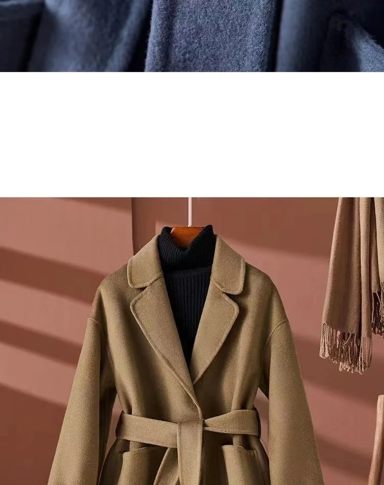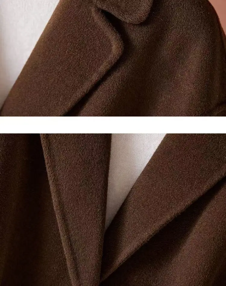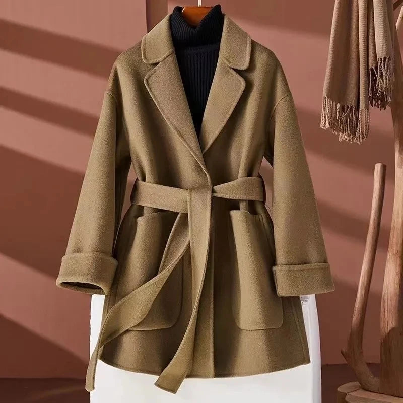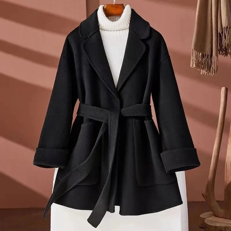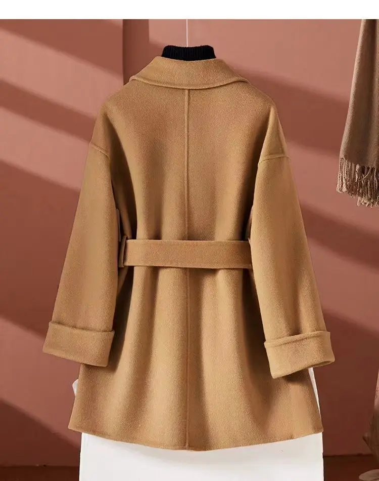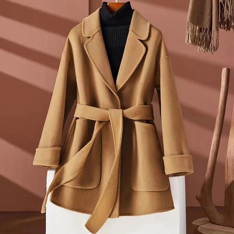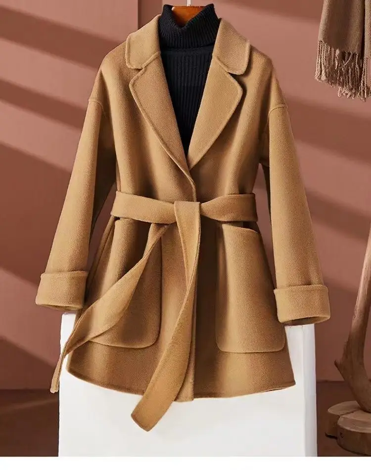 GETADME New Autumn Winter Double-Sided Wool Coat Women's Overcoat Fashion Long Suit Collar Loose Tie Leisure Wool Windbreaker Jacket