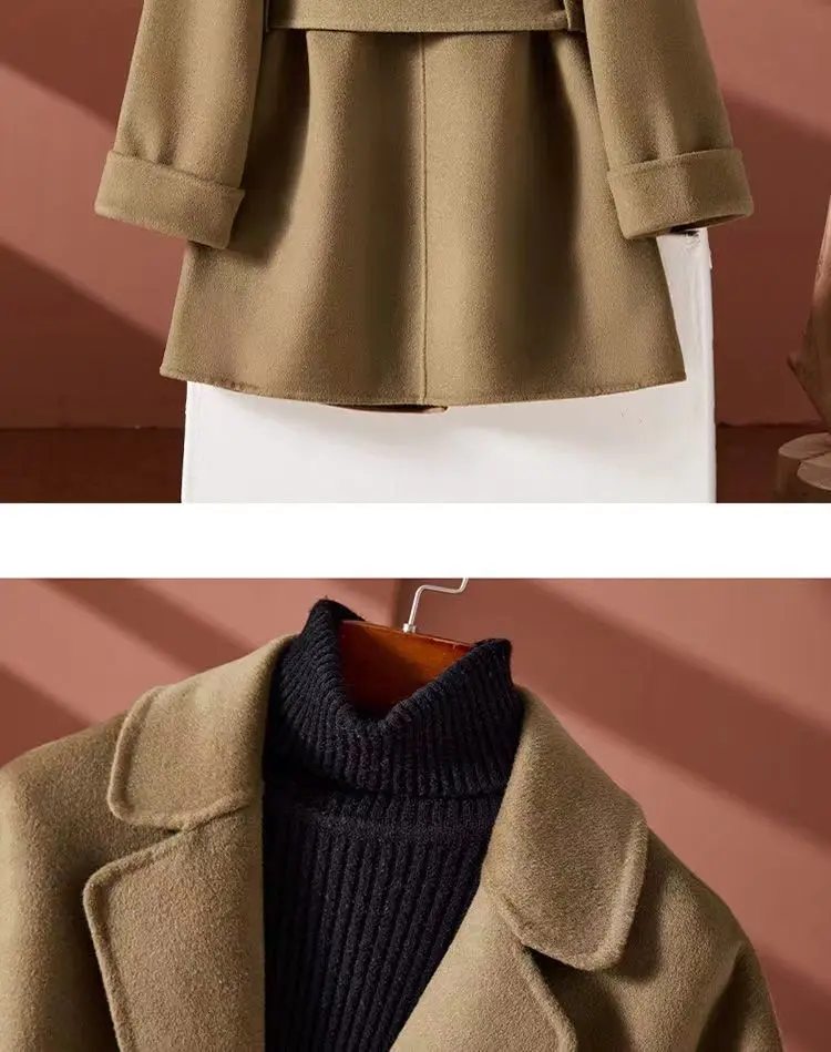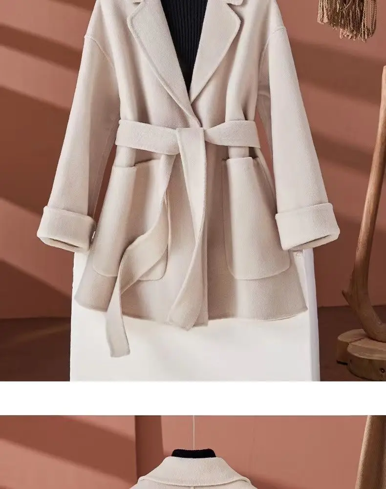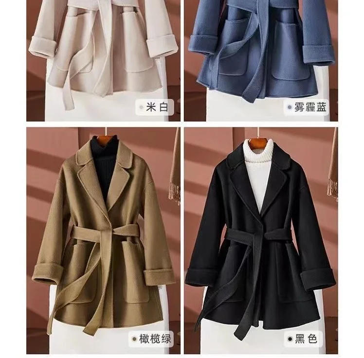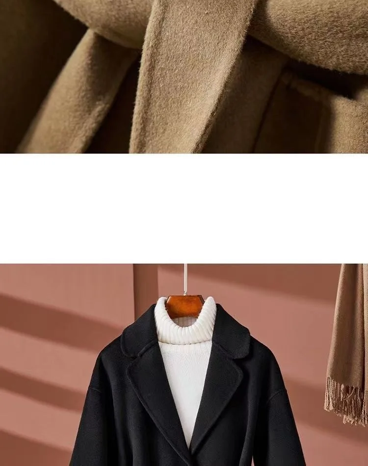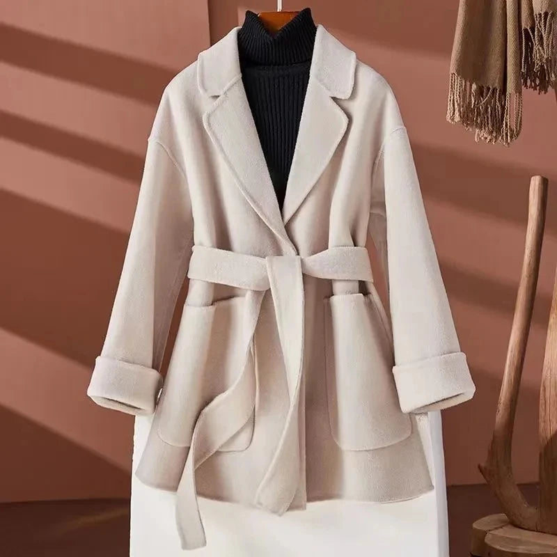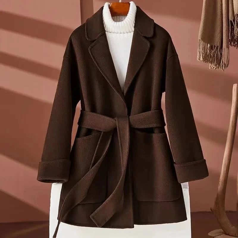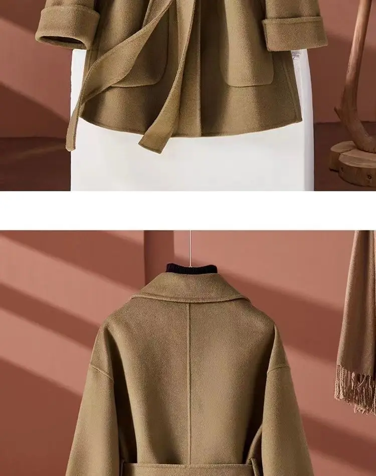 GETADME New Autumn Winter Double-Sided Wool Coat Women's Overcoat Fashion Long Suit Collar Loose Tie Leisure Wool Windbreaker Jacket