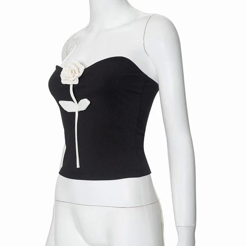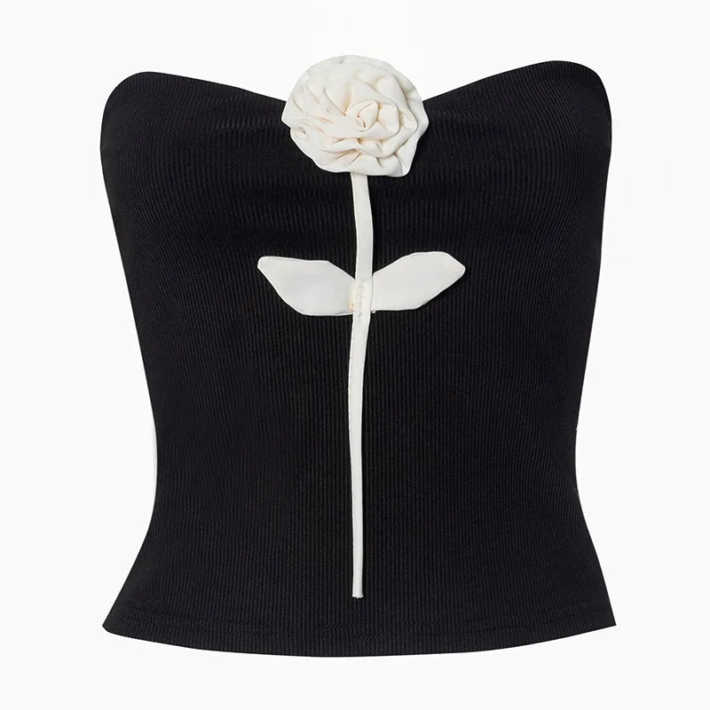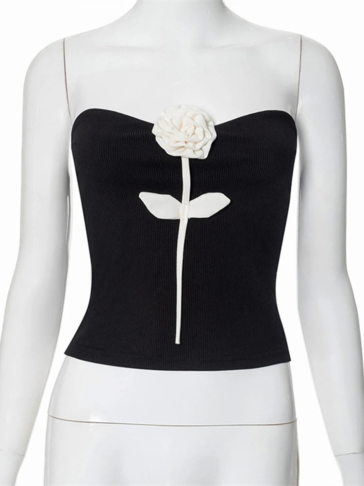 GETADME New Chic Strapless Ribbed Patchwork White Flower Appliques Decorative Skinny Tank Top Summer Hot Sexy Ladies Evening Party Vests