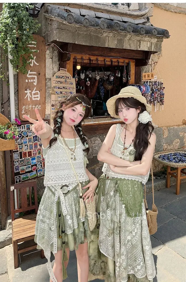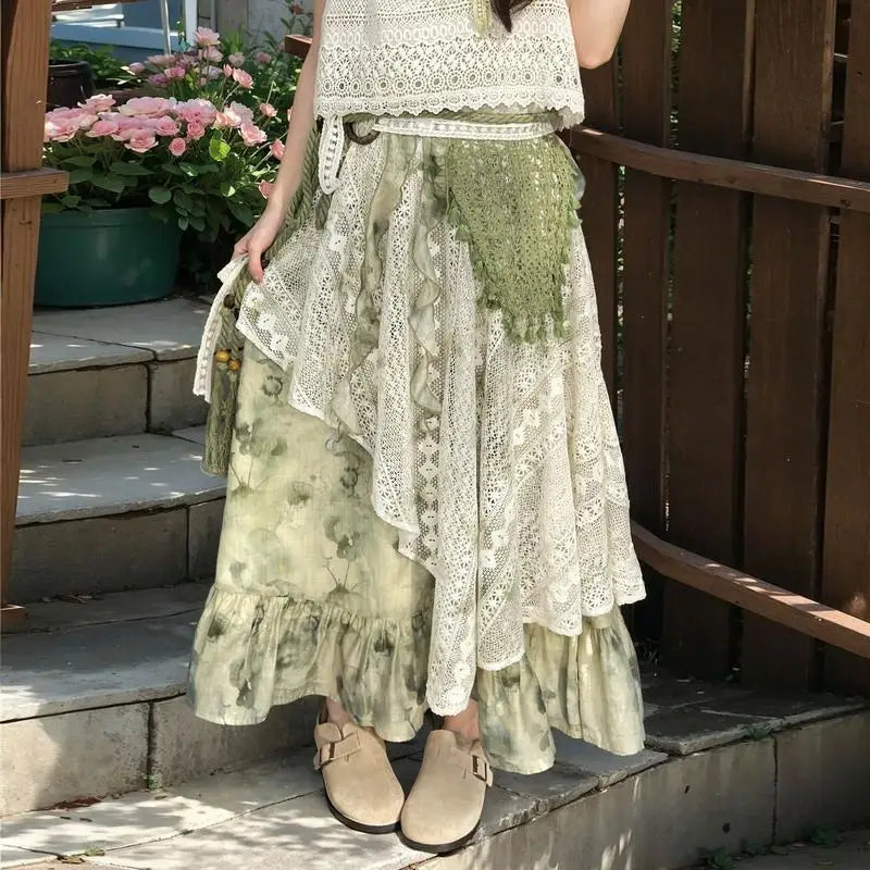 GETADME New Fashion Irregular Midi Skirt Women Vintage Tie Dye Printed a-Line Elegant Lace Patchwork Summer Skirts Y2k Mori Girl