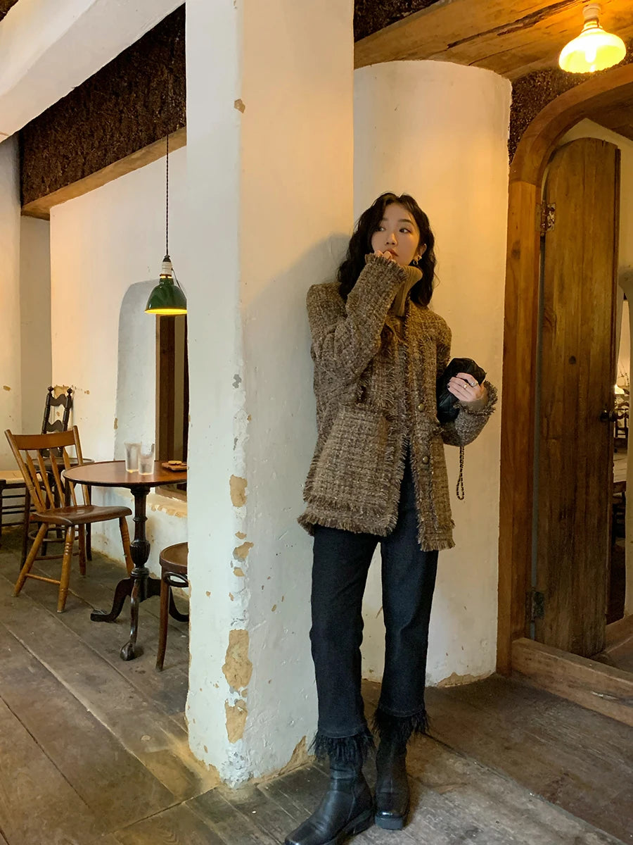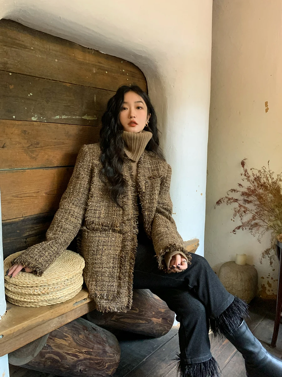 GETADME New High Quality Woolen Tweed Tassel Jacket Women Fashion Design Small Fragrance Long Sleeve Pockets Long Coat Outwears Korean
