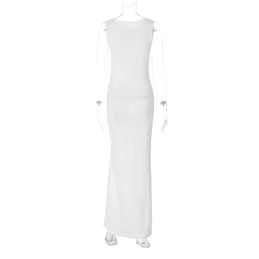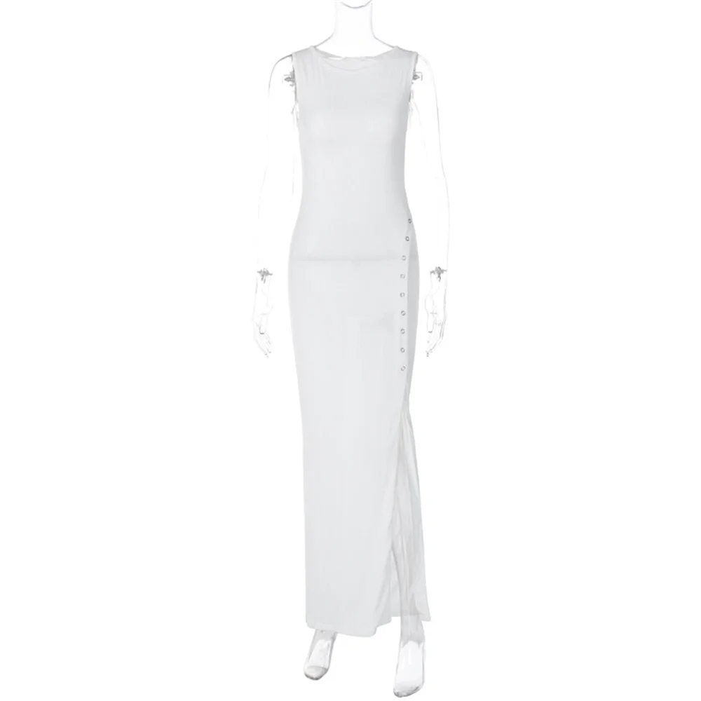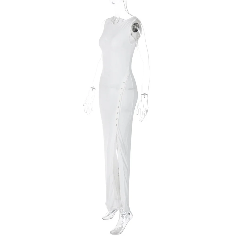 GETADME O Neck Chic Side Single-breasted White Women Dress Sleeveless Temperament Split Slim Bag Hip Bodycon Lady Holiday Going Out Gown