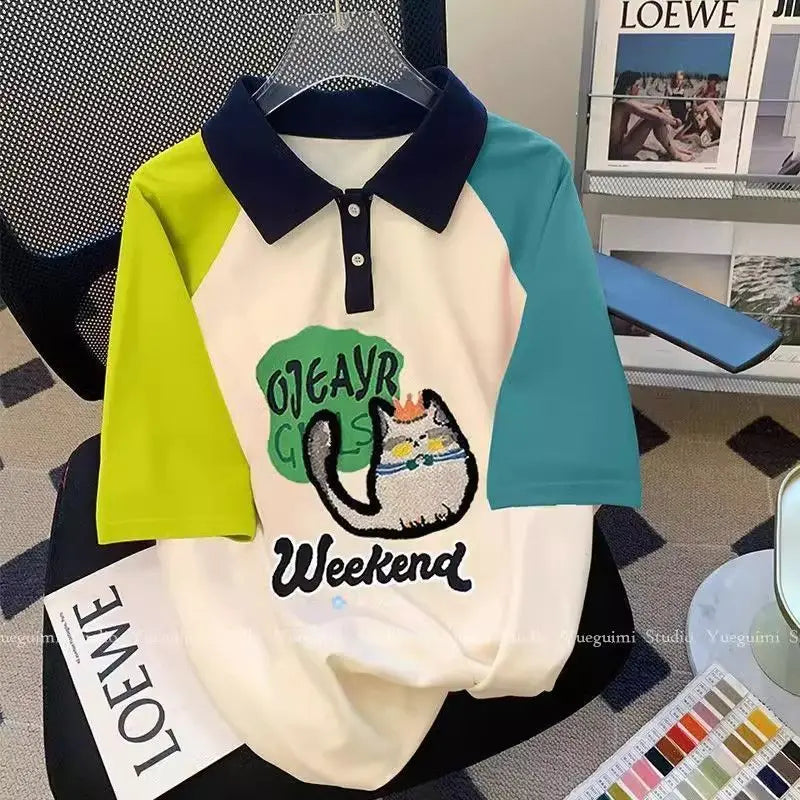 GETADME Oversized Preppy Style Patchwork Polo-Neck Short Sleeve T-Shirts Normcore Summer Loose Embroidered Top Tee Women Clothing Tops