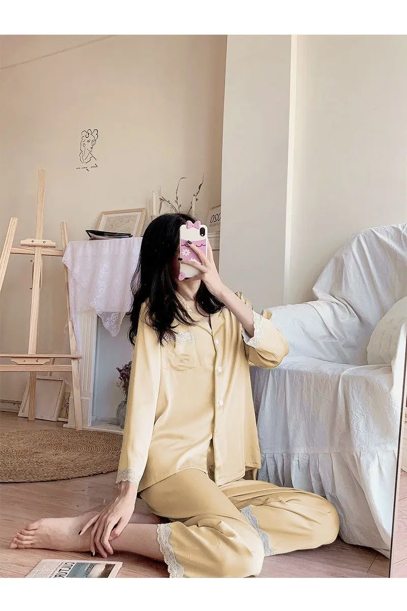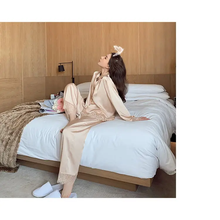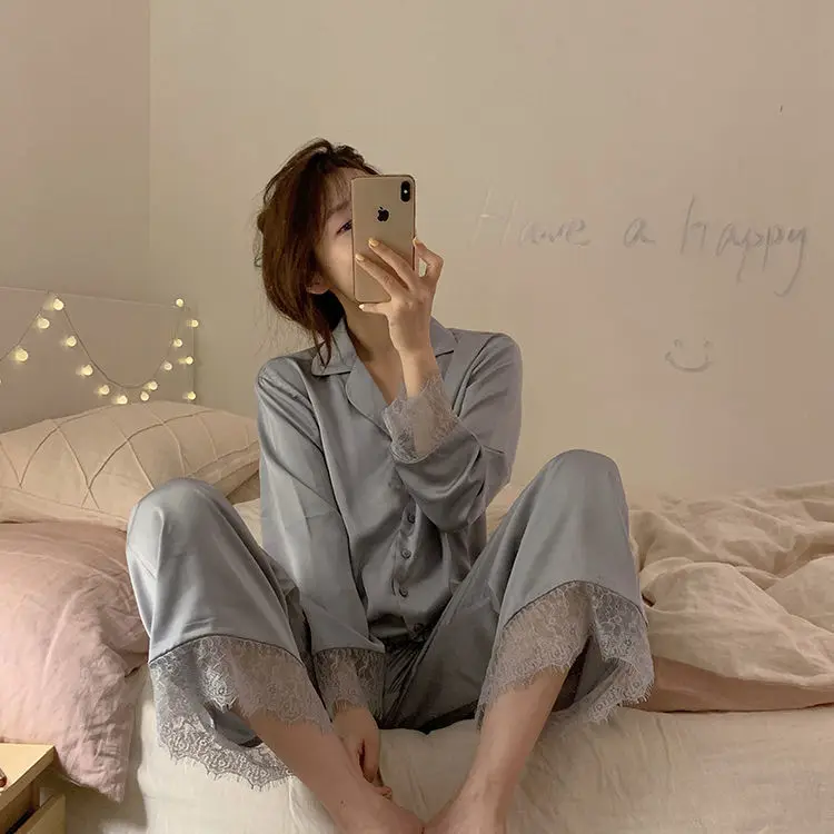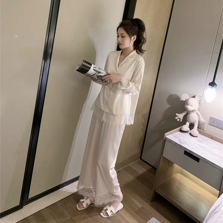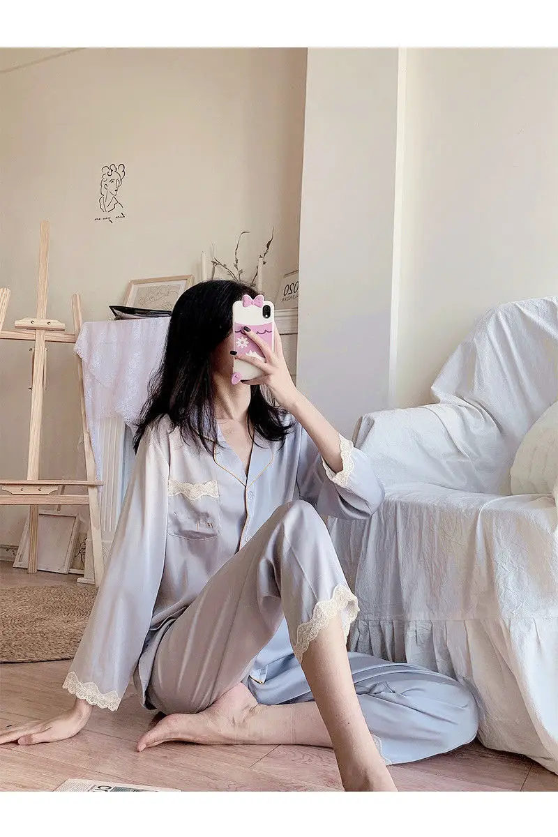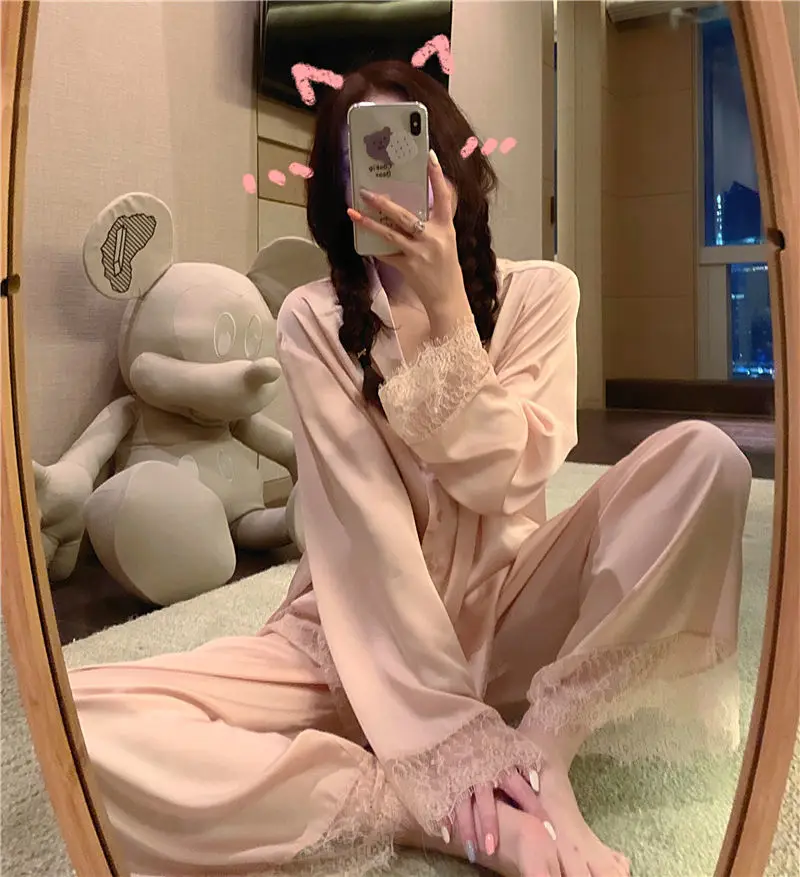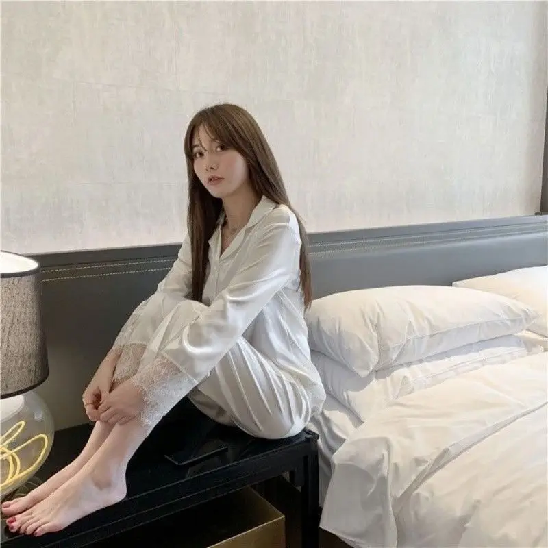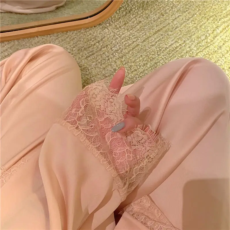 GETADME Pijamas Women Silk Nightgown Spring Autumn Long Sleeve Trousers Sexy Lace Sleepwear V-neck Loose Casual Simple Thin Pajama Sets