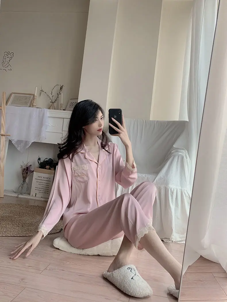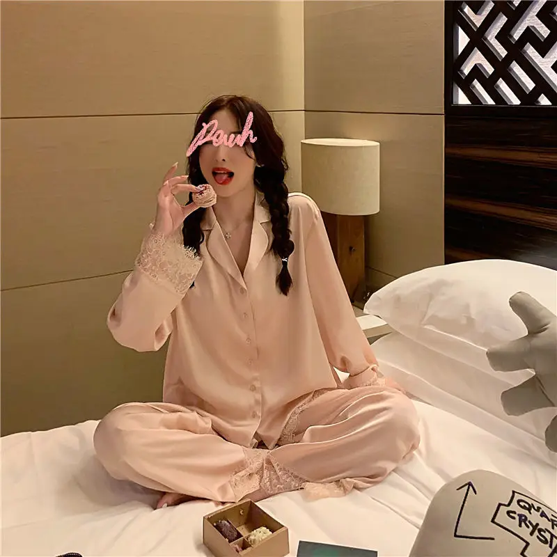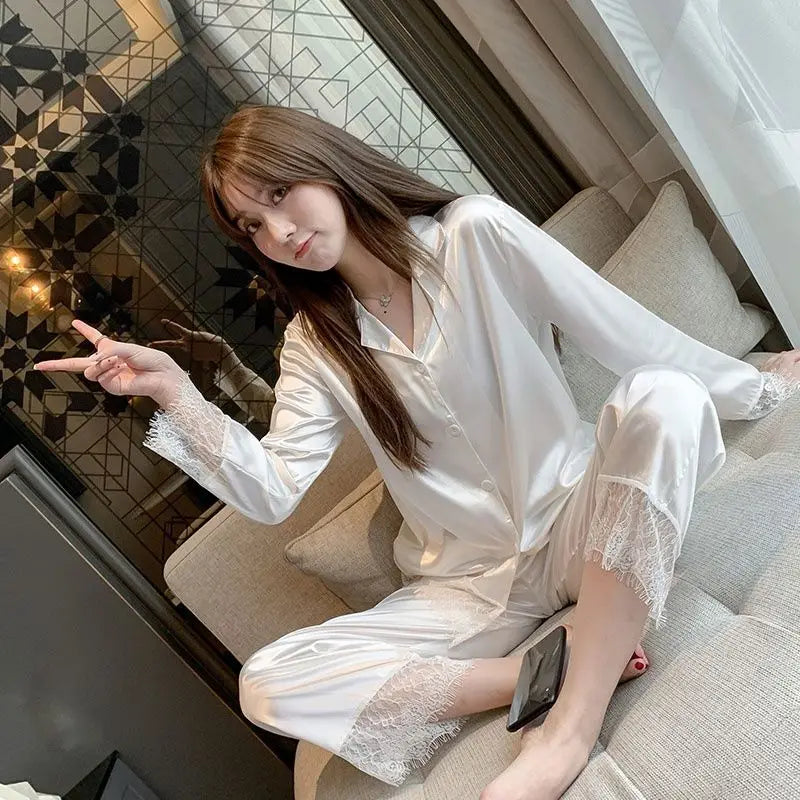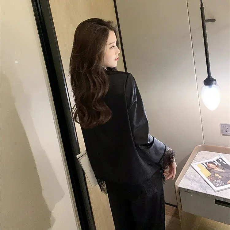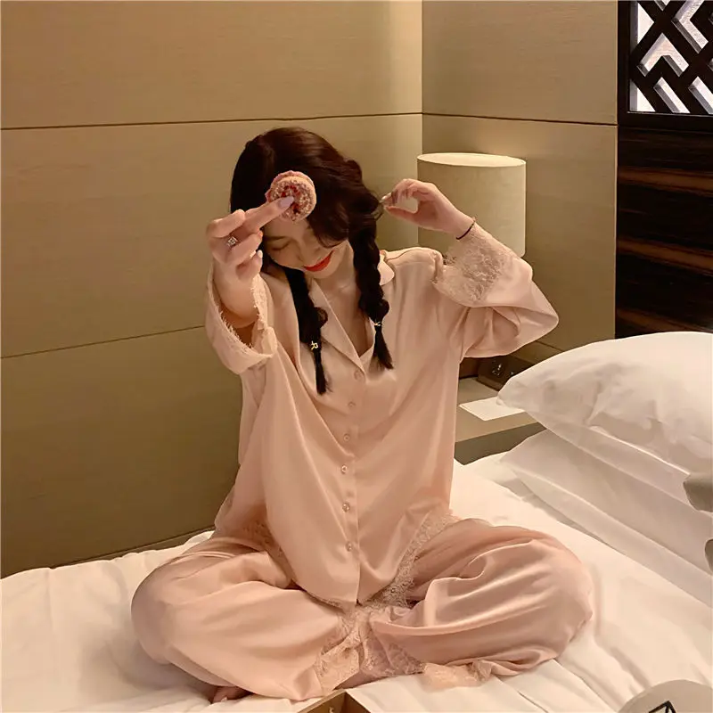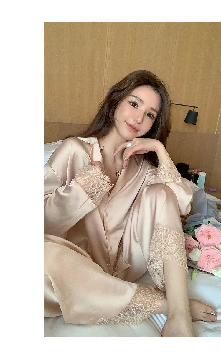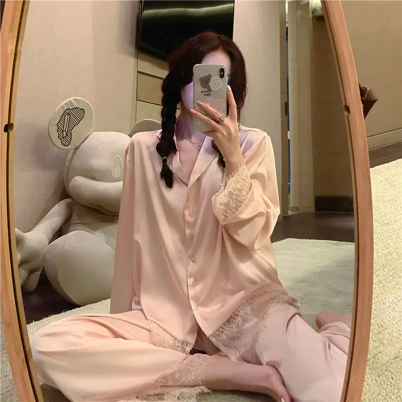 GETADME Pijamas Women Silk Nightgown Spring Autumn Long Sleeve Trousers Sexy Lace Sleepwear V-neck Loose Casual Simple Thin Pajama Sets