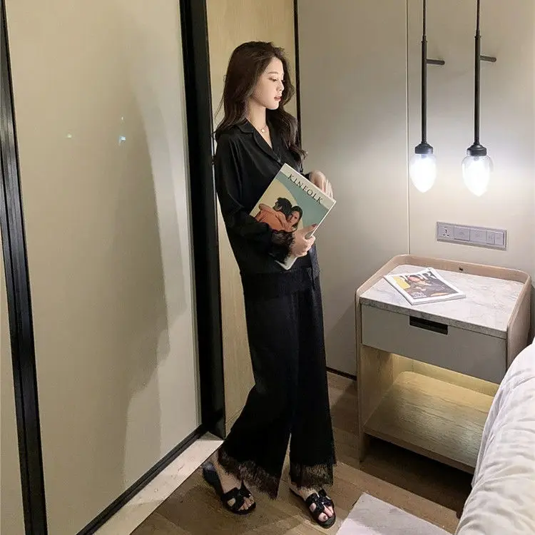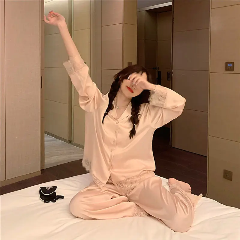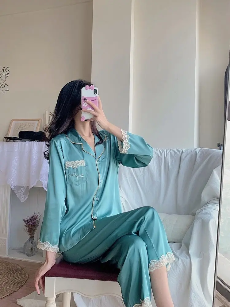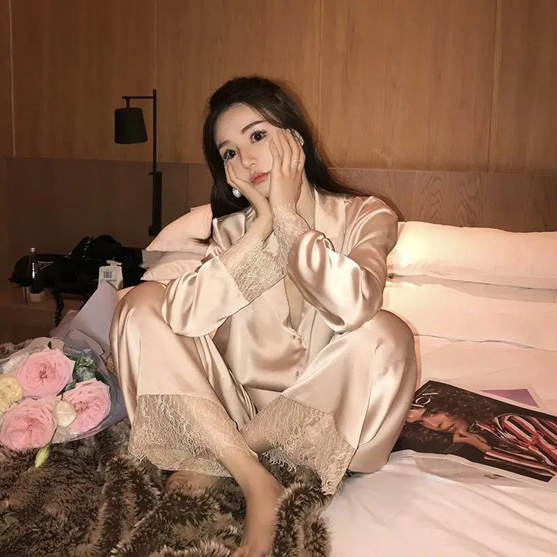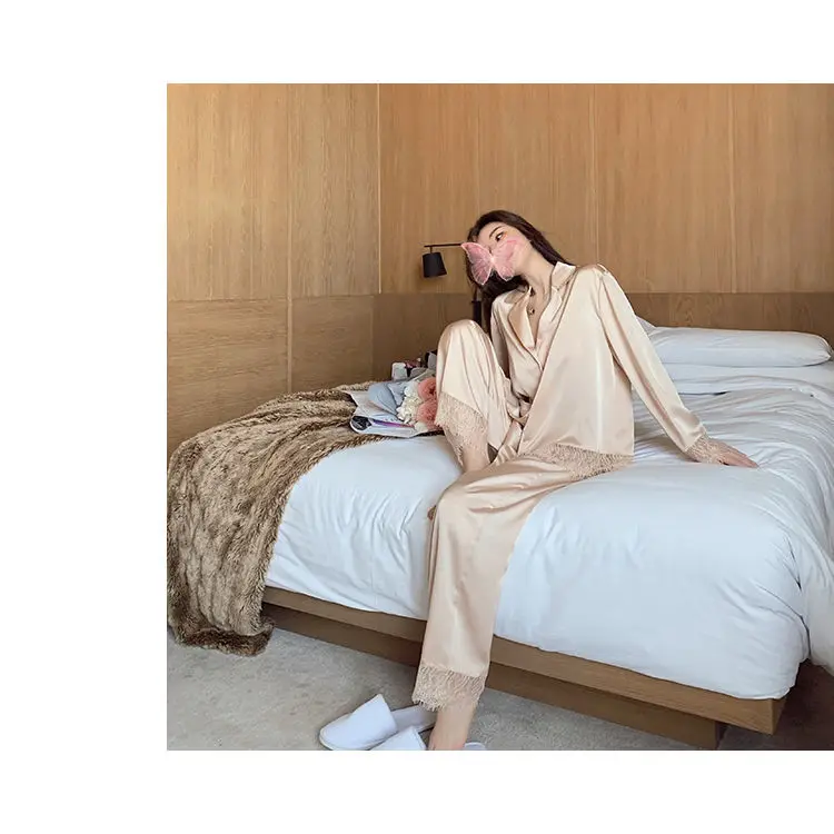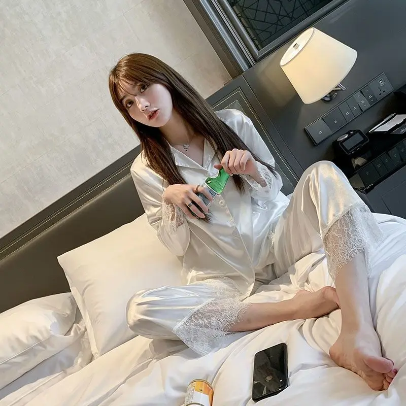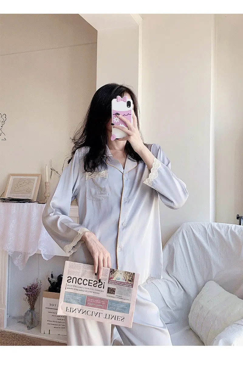 GETADME Pijamas Women Silk Nightgown Spring Autumn Long Sleeve Trousers Sexy Lace Sleepwear V-neck Loose Casual Simple Thin Pajama Sets
