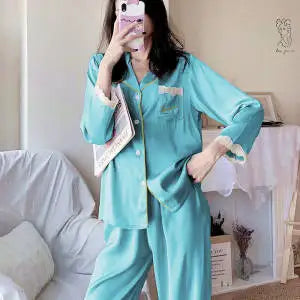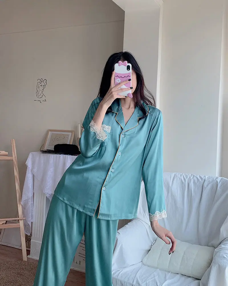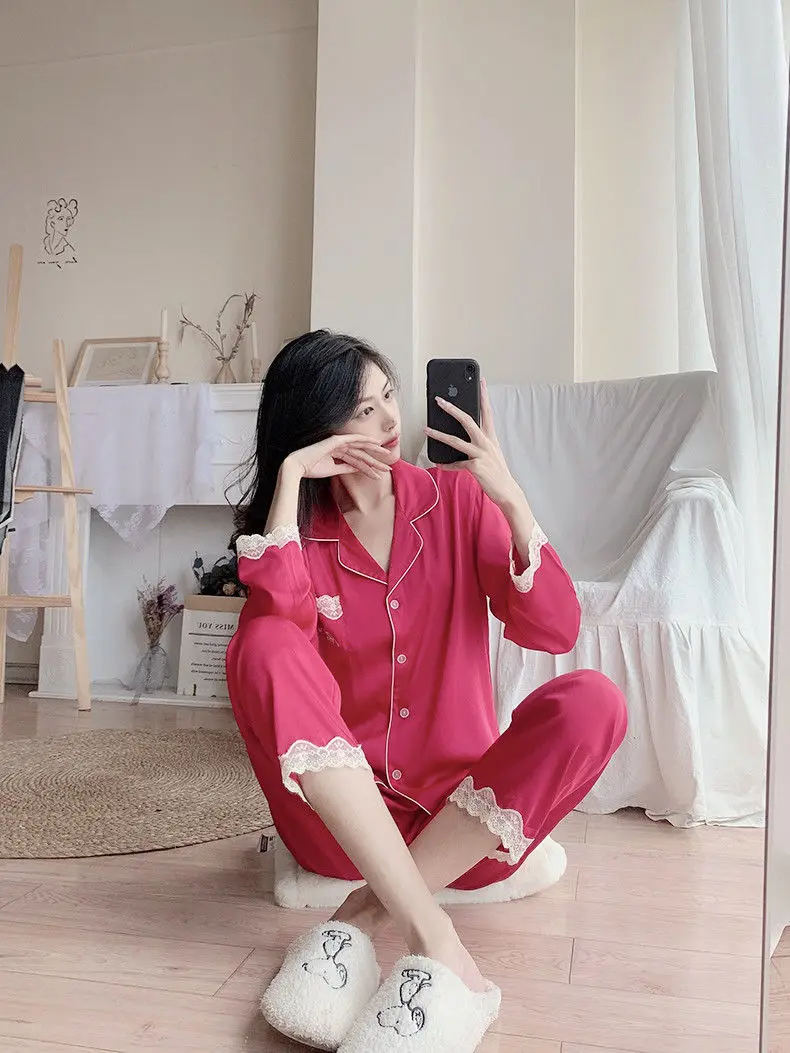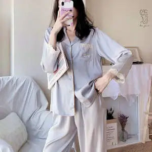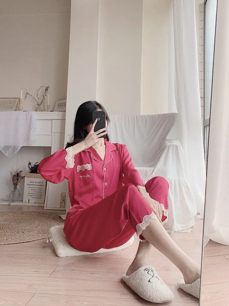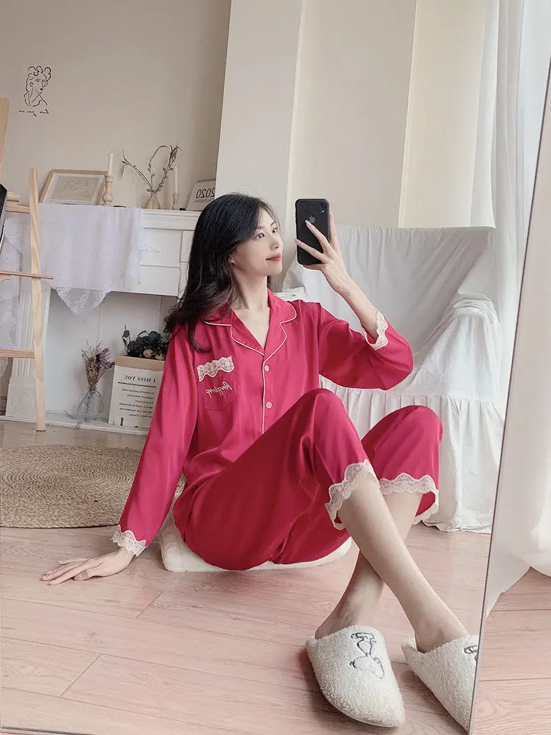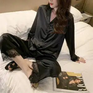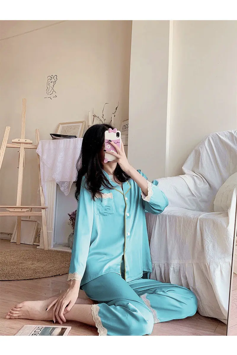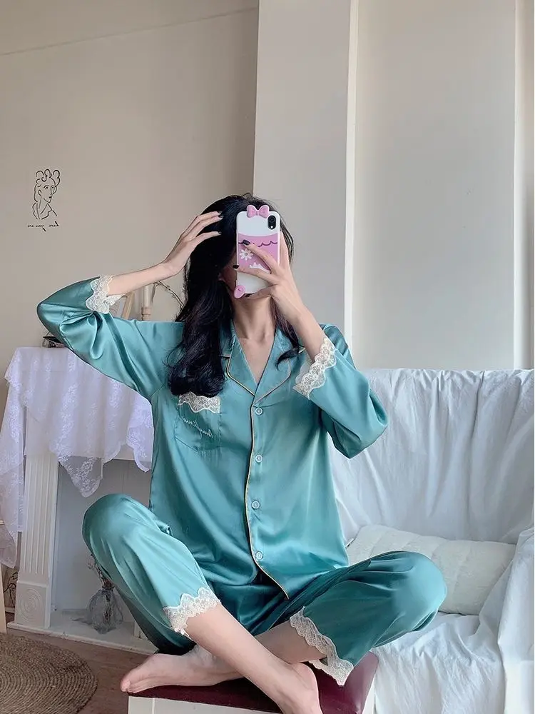 GETADME Pijamas Women Silk Nightgown Spring Autumn Long Sleeve Trousers Sexy Lace Sleepwear V-neck Loose Casual Simple Thin Pajama Sets