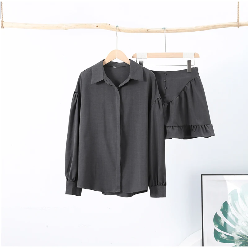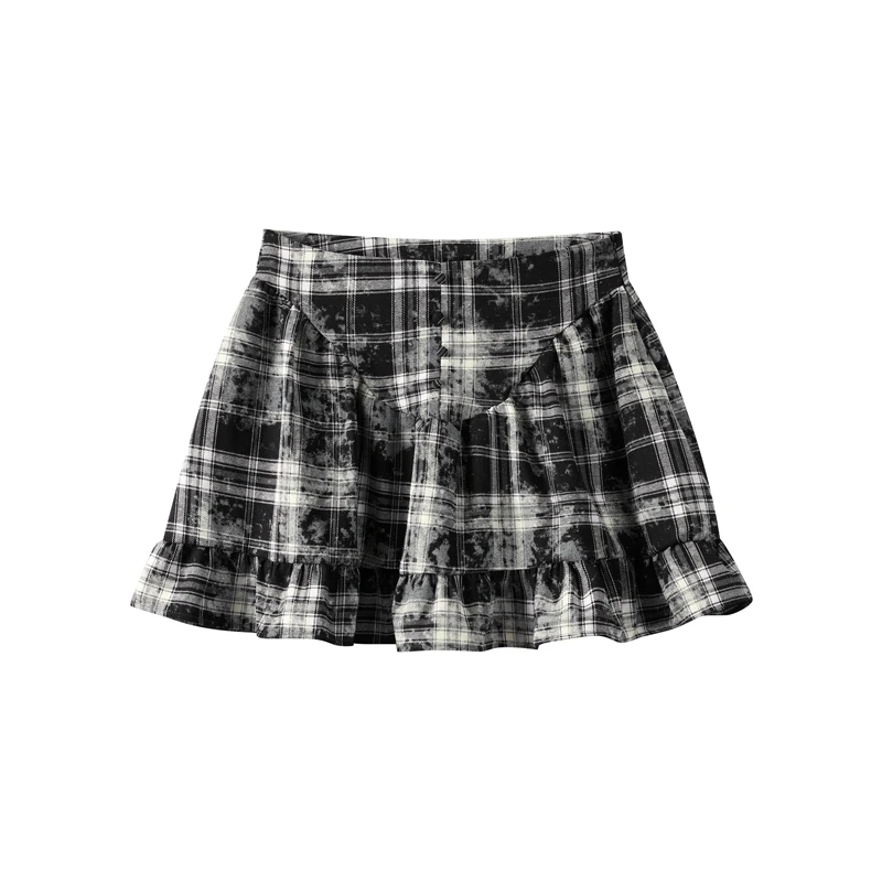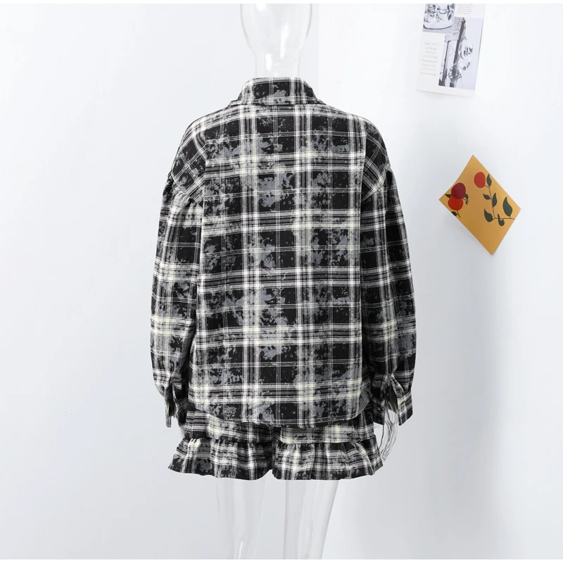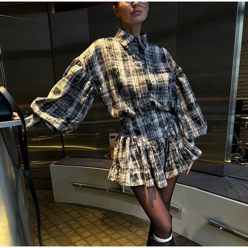 GETADME Plaid 2 Pieces Suits Women 2025 Spring Lapel Lantern Sleeves Single Breasted Shirt A-line Pleated Mini Skirt Female Vintage Sets