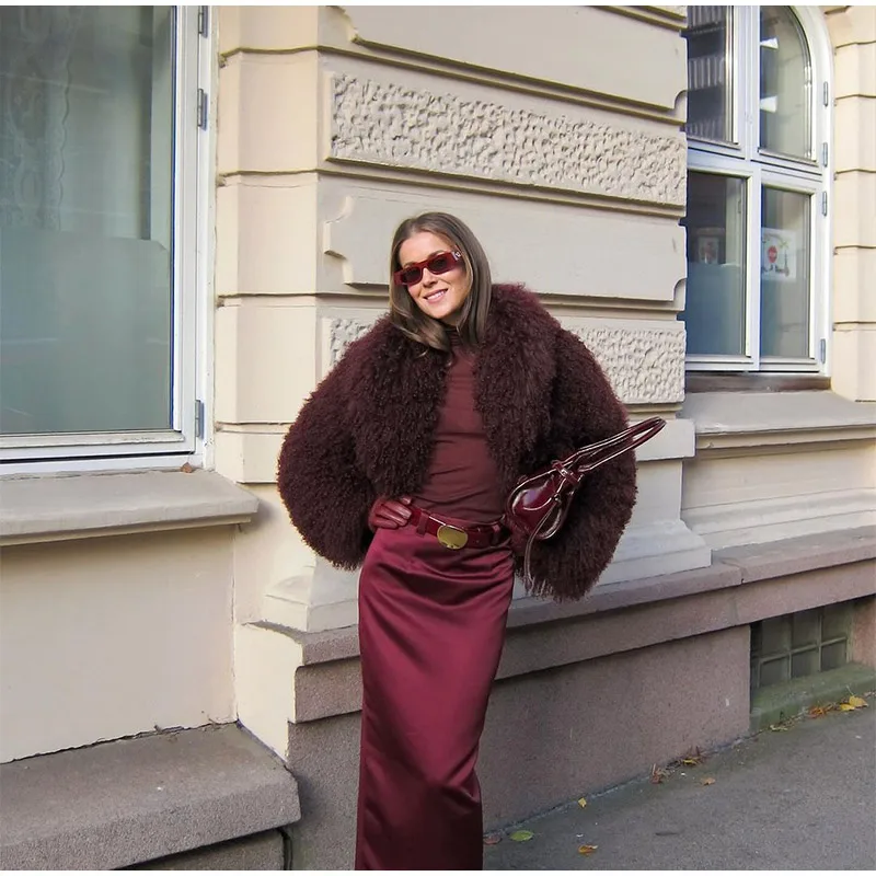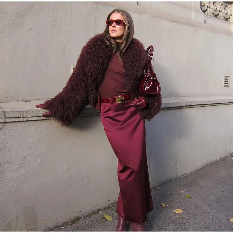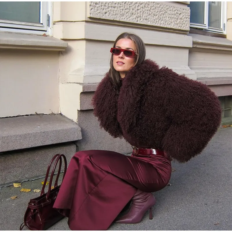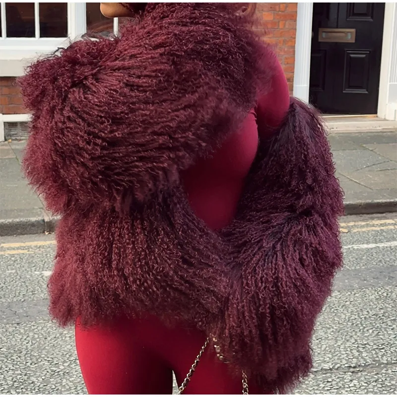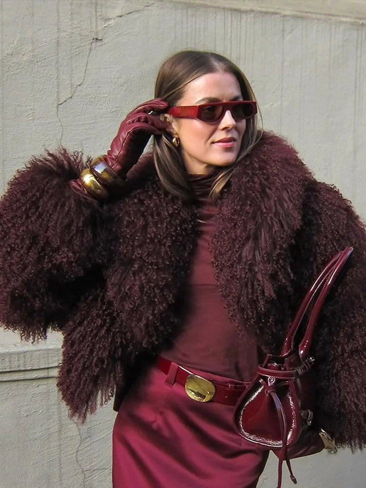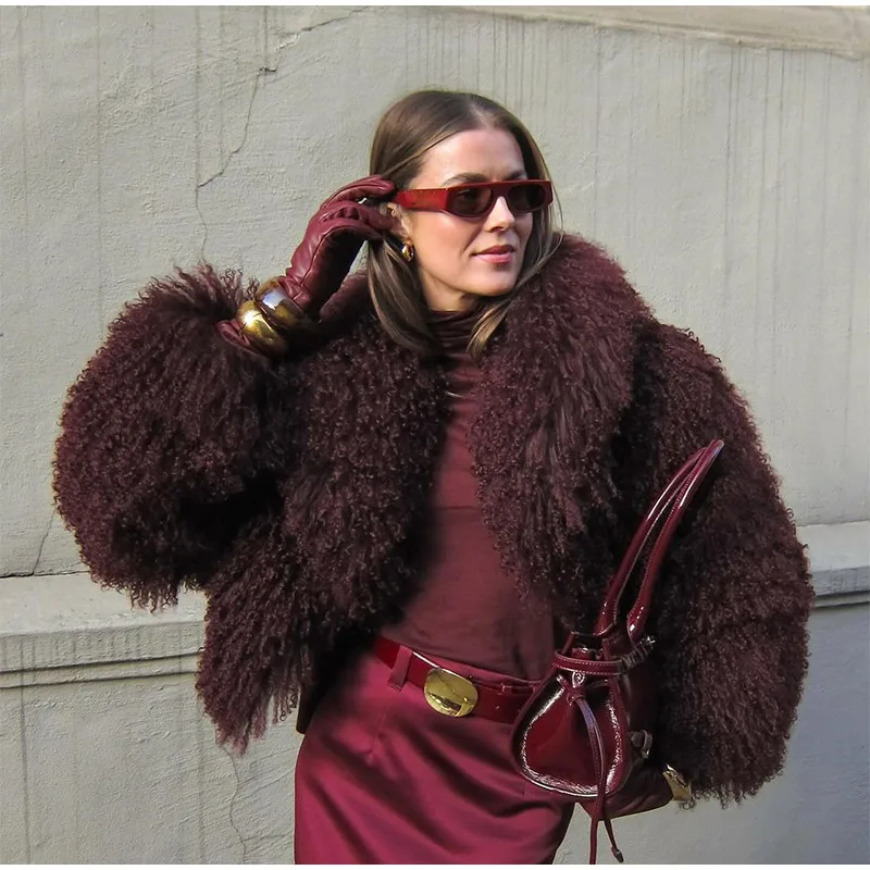 GETADME Retro Burgundy Tassels Faux Fur Long Sleeves Short Coat Elegant Loose Turn-down Collar Jacket 2025 New Woman High Street Coats