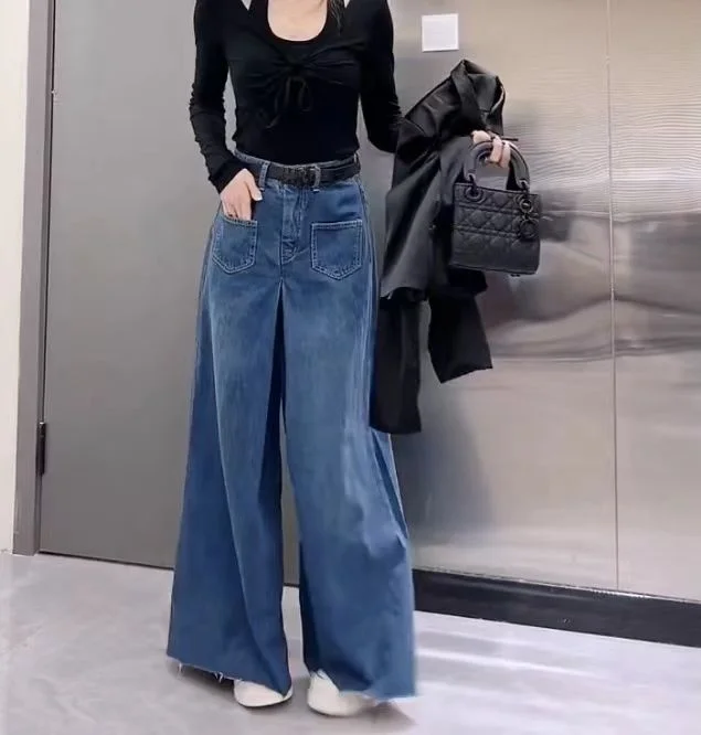 GETADME Retro Loose Super Wide-leg Jeans Women's 2025 Spring New Design Rough Edge Culottes Drape Floor Pants Women's Clothing Simple