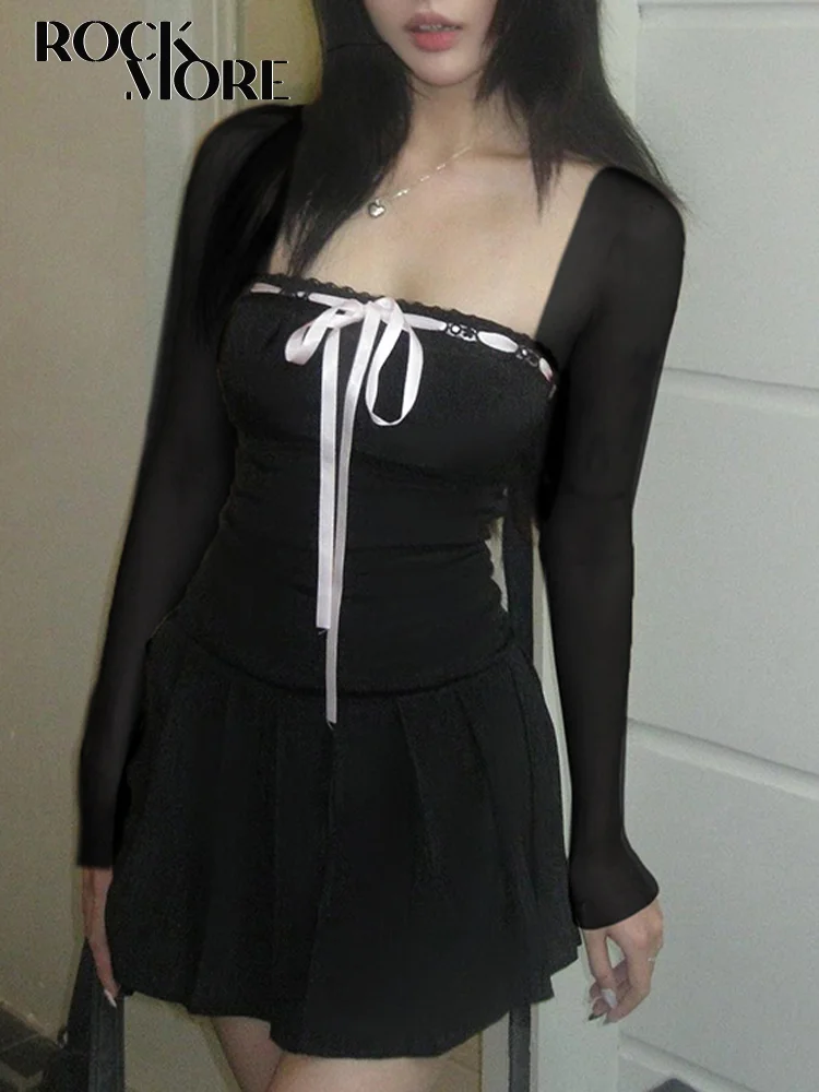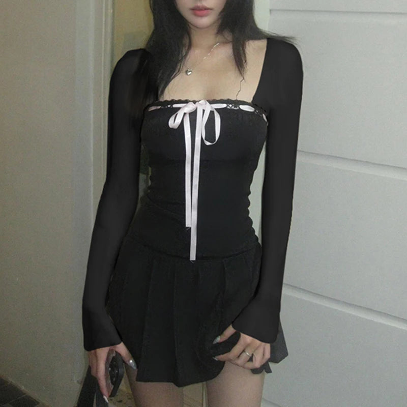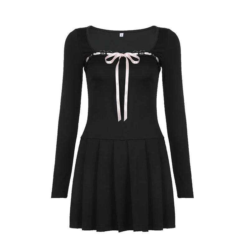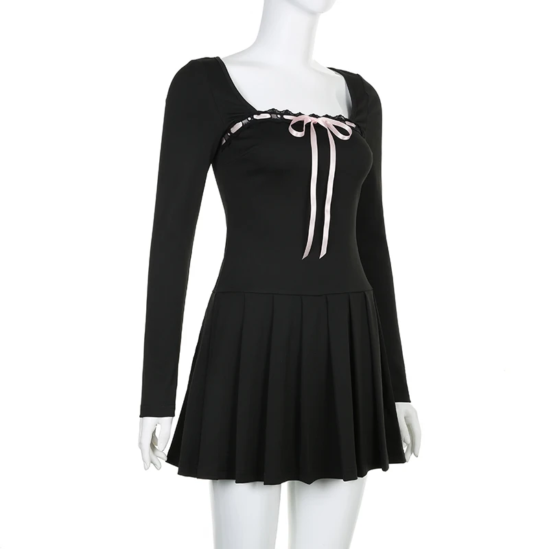 GETADME Rockmore Black Lace Up Square Collar Dresses Fashion Women Balletcore Aesthetic Bodycon Long Sleeve Mini Dress Korean Style