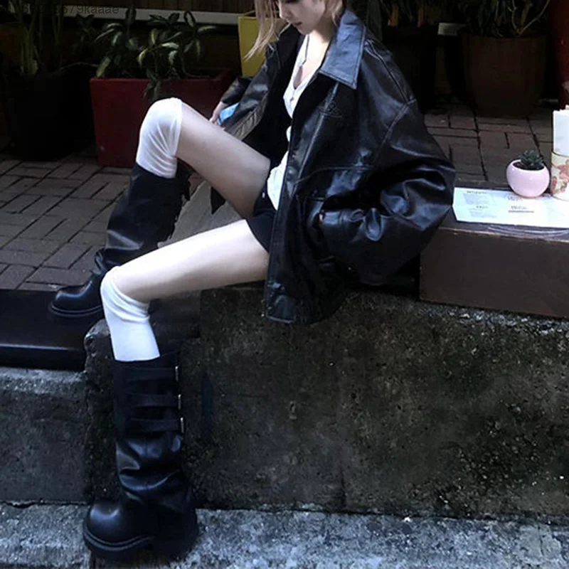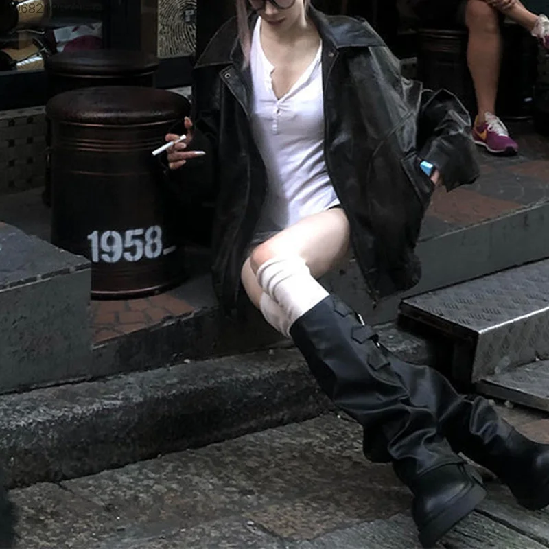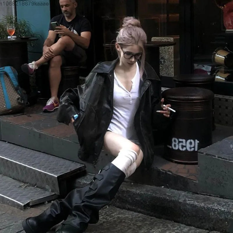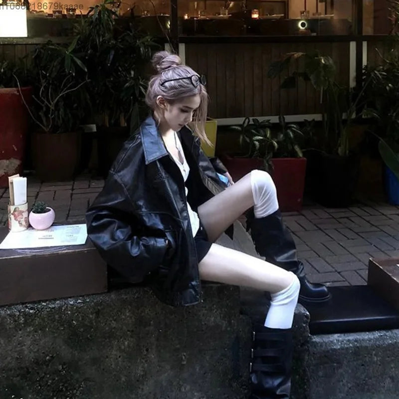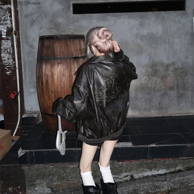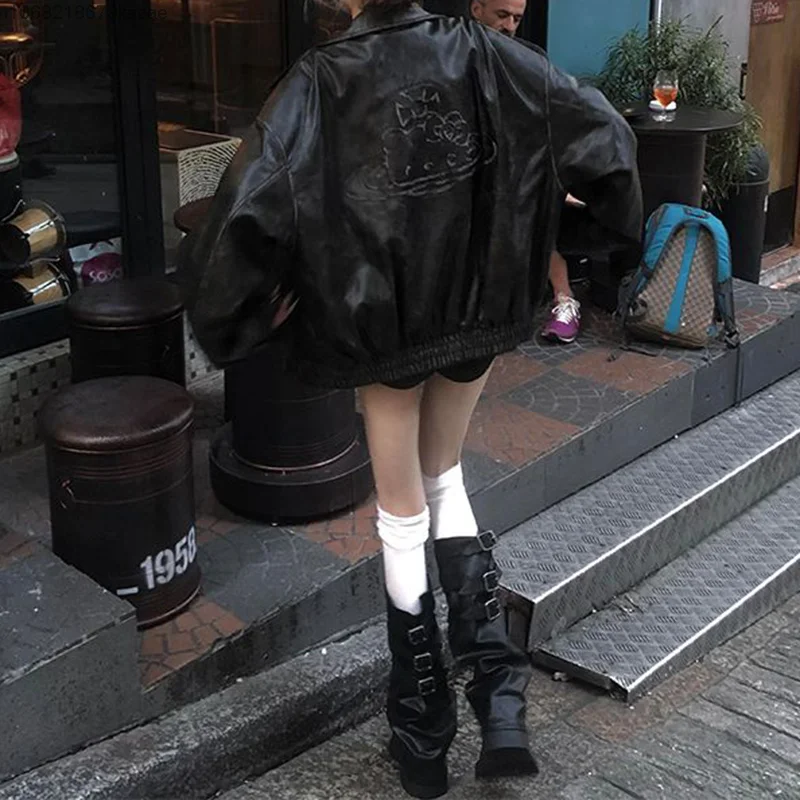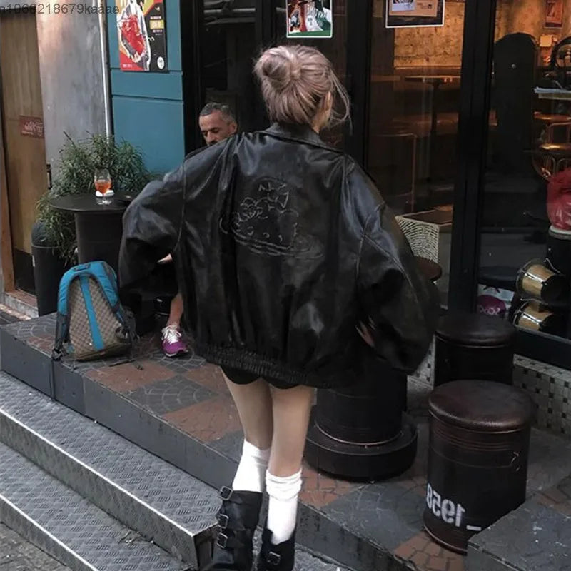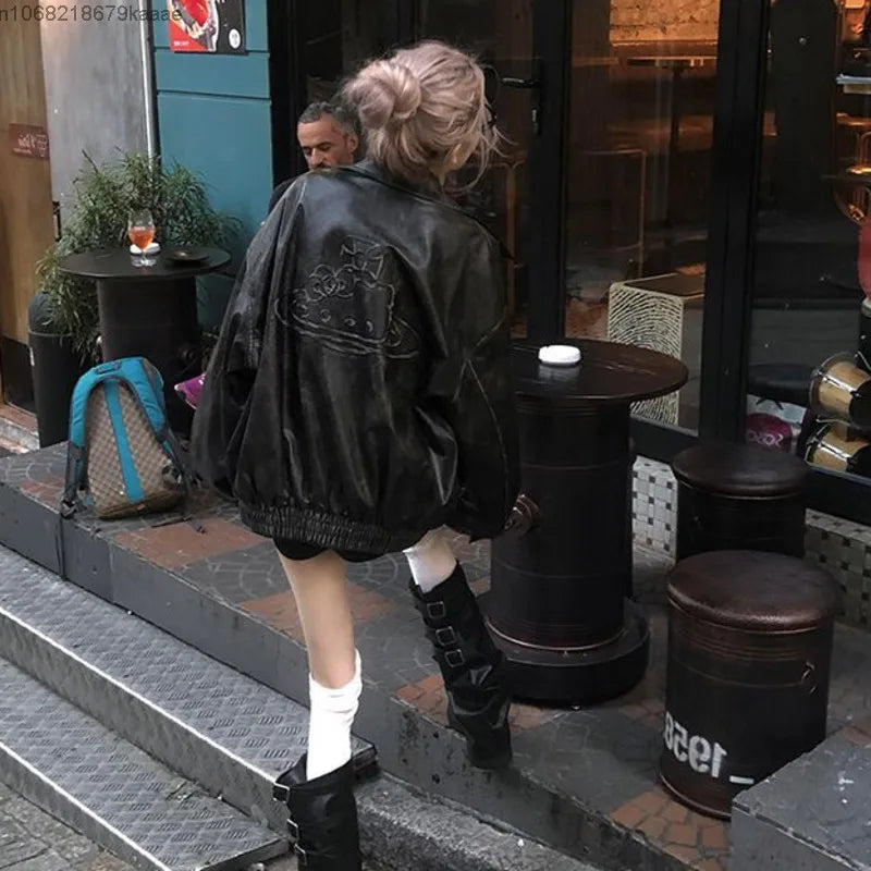 GETADME Sanrio Hello Kitty Black Leather Jacket For Women American Trend Vintage Zipper Coat Cool Pleated Design Niche Motorcycle Jacket