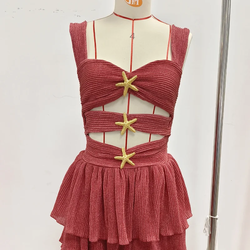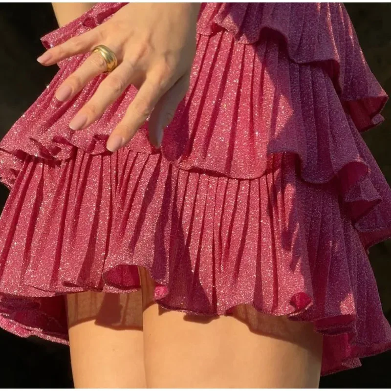 GETADME Sexy Shiny Hollow Out Layered Ruffle Mini Dress Women Fashion Backless Sleeveless Slim Dresses 2025 New Lady Party Vocation Gown