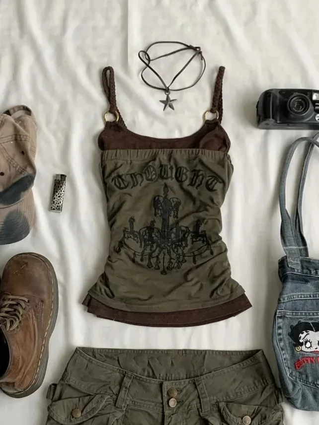 GETADME Sexy Sling T-shirts Vintage 2 Piece Set Woman Clothing Letter Print Y2k Crop Tops Punk Backless Harajuku Streetwear Sweet 2000s