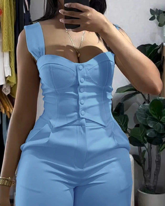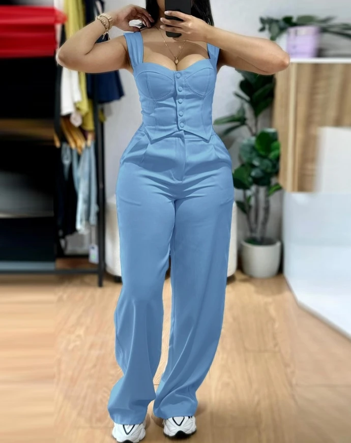 GETADME Sexy Two Piece Sets Women Outfits Sleeveless Backless Buttoned Vest Top & High Waist Wide Leg Straight Trouser Women's Pants Set