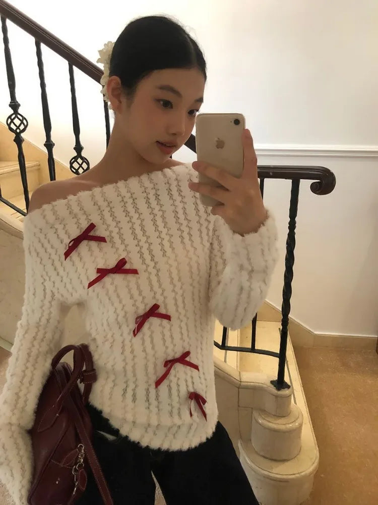 GETADME Skew Collar Off Shoulder Knitted Tops Women 2025 Spring Autumn New Bottoming Pullovers Y2k Long Sleeve Slim Fit Sweaters